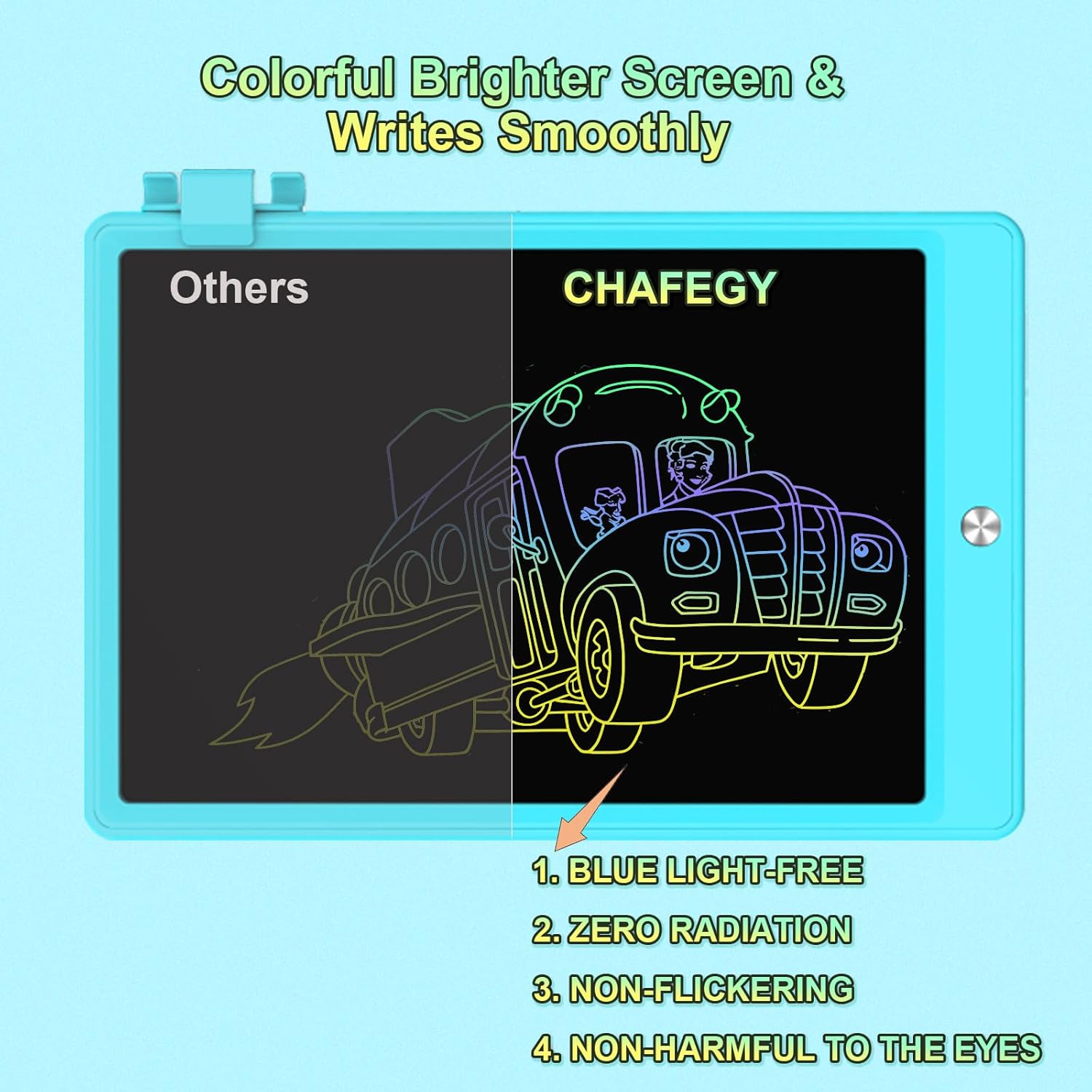 - 🖍️ 【Multi-Functional Screen】Drawing pad for kids adopts advanced pressure-sensing technology, the colors after drawing on it, smooth and Colorful, NO radiation, NO glare, NO blue light. Drawing board is a top-rated gift for Christmas, birthdays.