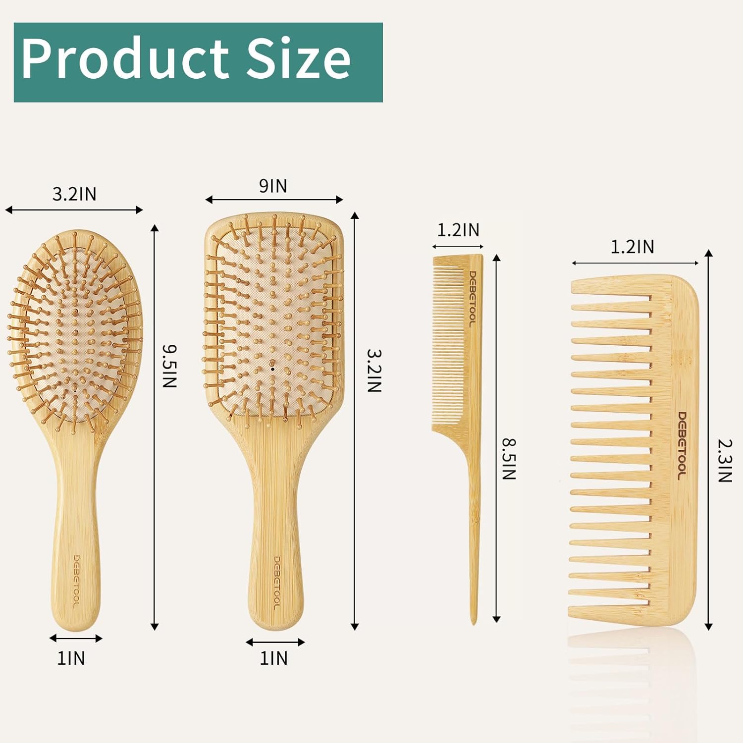 Bamboo Hair Brush Set - Natural Bamboo Paddle Detangling Hairbrush and Comb Set, Suit for Thick/Thin -Gift for Women Men and Kids
