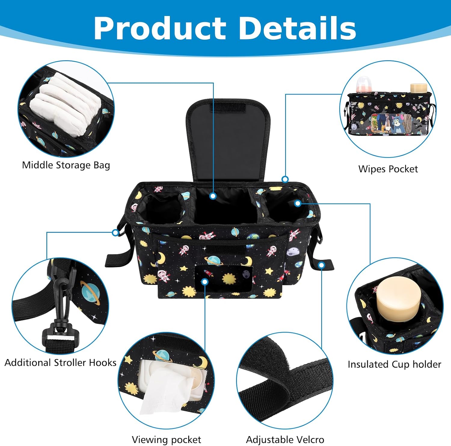 - Structured Stroller Organizer: This stroller caddy features an internal partition system that provides multifunctional compartments for efficient organization. The middle large storage compartment can storage baby diapers, toys, clothes, pacifiers or other accessories; 2 insulated cup holders on two sides, can be used to place baby bottles, beverage cups, water bottles etc. A convenient open pocket on the front for easy access to wet wipes or tissue.