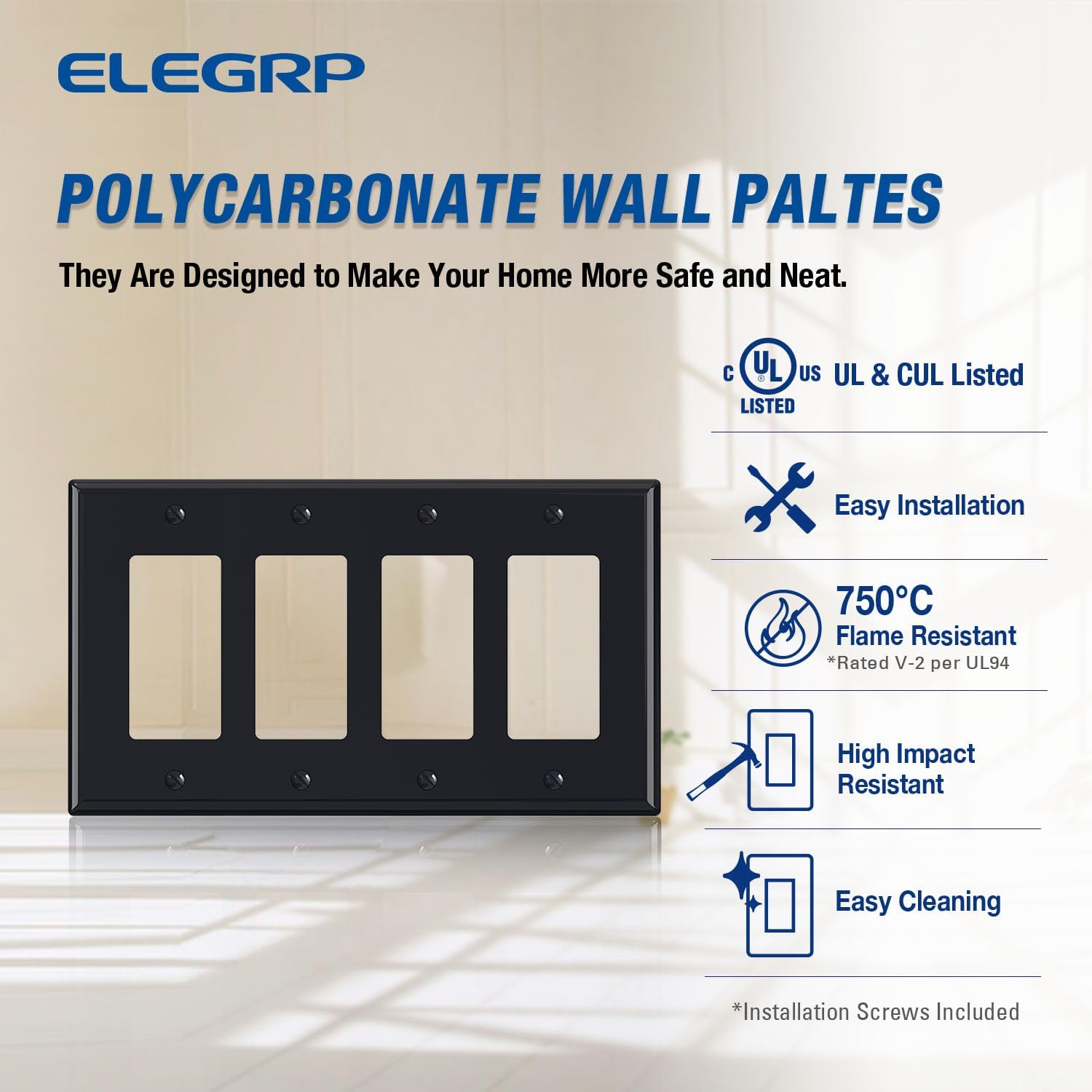 ELEGRP 4-Gang Decorative Wall Plates, Mid-Size 4.88" H x 8.57" L Unbreakable Thermoplastic Faceplate Cover for Decorator Receptacle Outlet Switch, UL Listed (2 Pack, Glossy Black)
