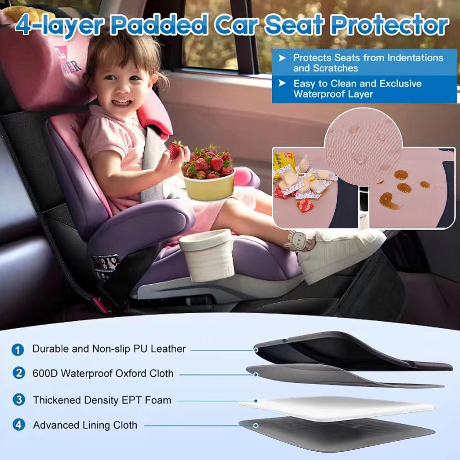 - Car seat protector covers for baby carseat made of waterproof durable 600D polyester with thick padding. Baby car seat cover can protects the back seat of the car from wear and tear of the child seat, make us comfortable while traveling