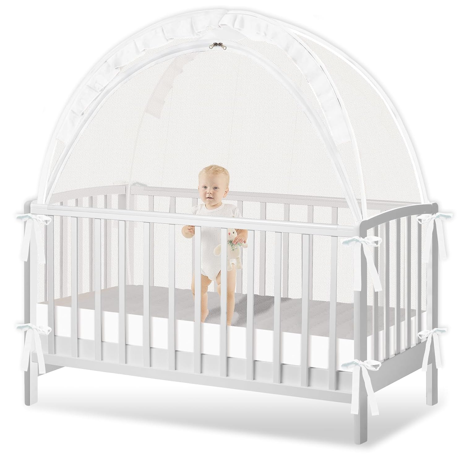 Crib Tent to Keep Baby from Climbing Out - Crib Net to Keep Baby in - Pop Up Breathable Cribs Cover - Canopy with Upgrade Strong Mesh and Durable Zipper (White, Lager)