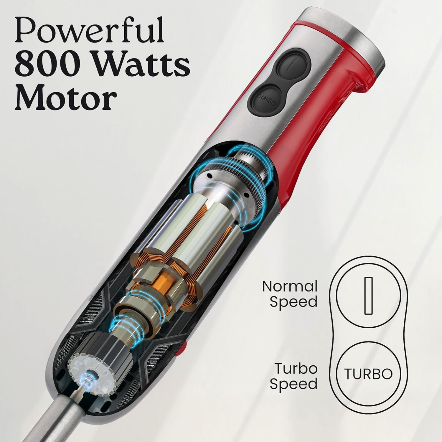 Zulay 4-in-1 Immersion Stick Mixer Hand Blender - 800 Watts, 12 Speeds, 5-ft Power Electric Cord, Handheld Portable, Stainless Steel Blades - With Whisk, Frother & Stick Blender Attachments - Red