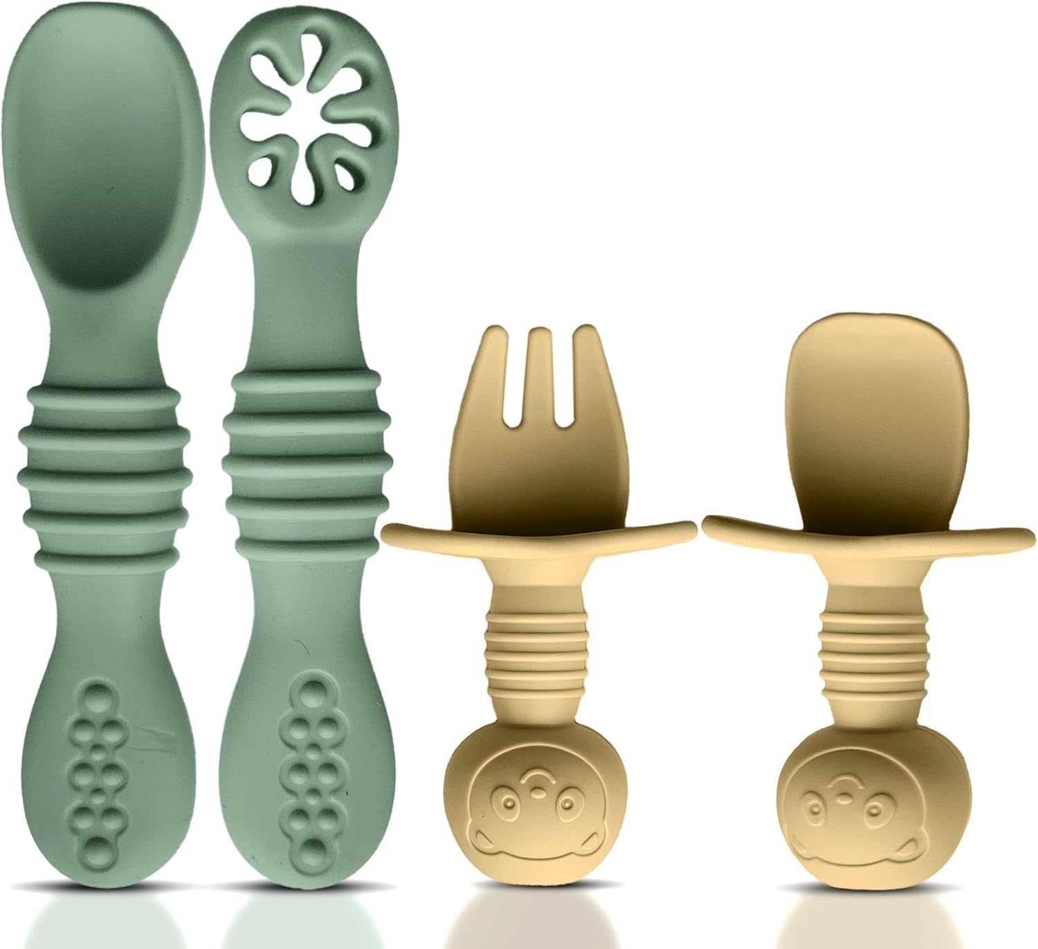 4pc Silicone Baby Spoons Self Feeding Baby Utensils 6-12 Months - 3 Baby Spoon - 1 Baby Fork - Toddler Cutlery Set - BPA Free, Dishwasher Safe - Baby Eating Essentials (Green/Yellow) - Small