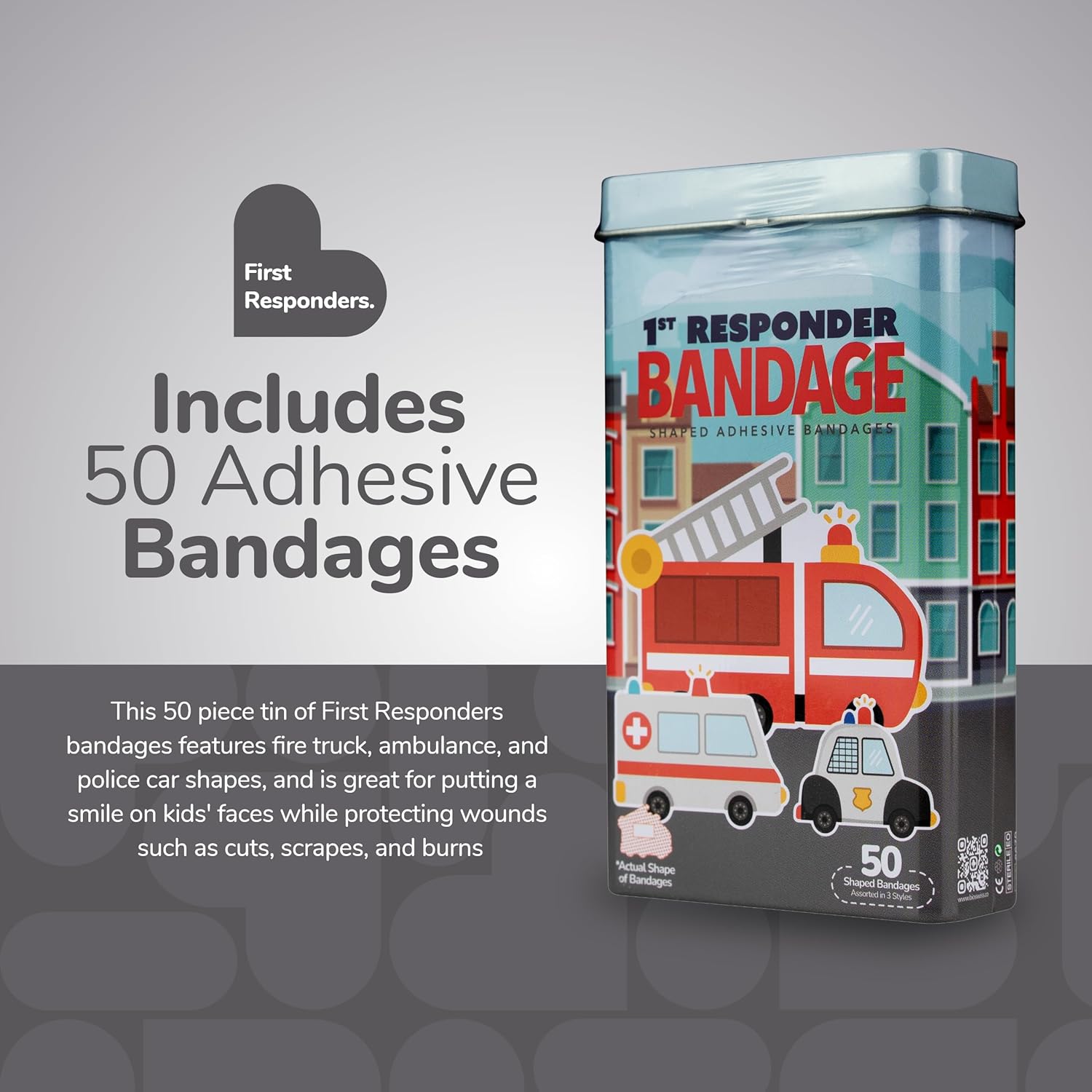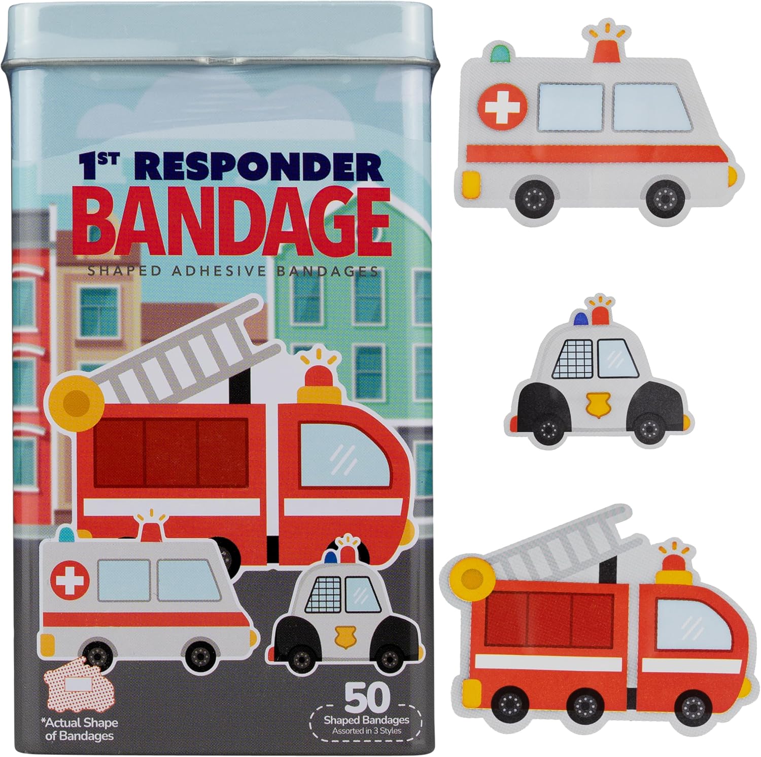 - FIRST RESPONDER BANDAGES: This 50 piece tin of First Responders bandages features fire truck, ambulance, and police car shapes, and is great for putting a smile on kids' faces while protecting wounds such as cuts, scrapes, and burns; sticky bandages come in a cute cardboard box and are perfect for kids and adults alike, and also for school nurses and pediatric doctors