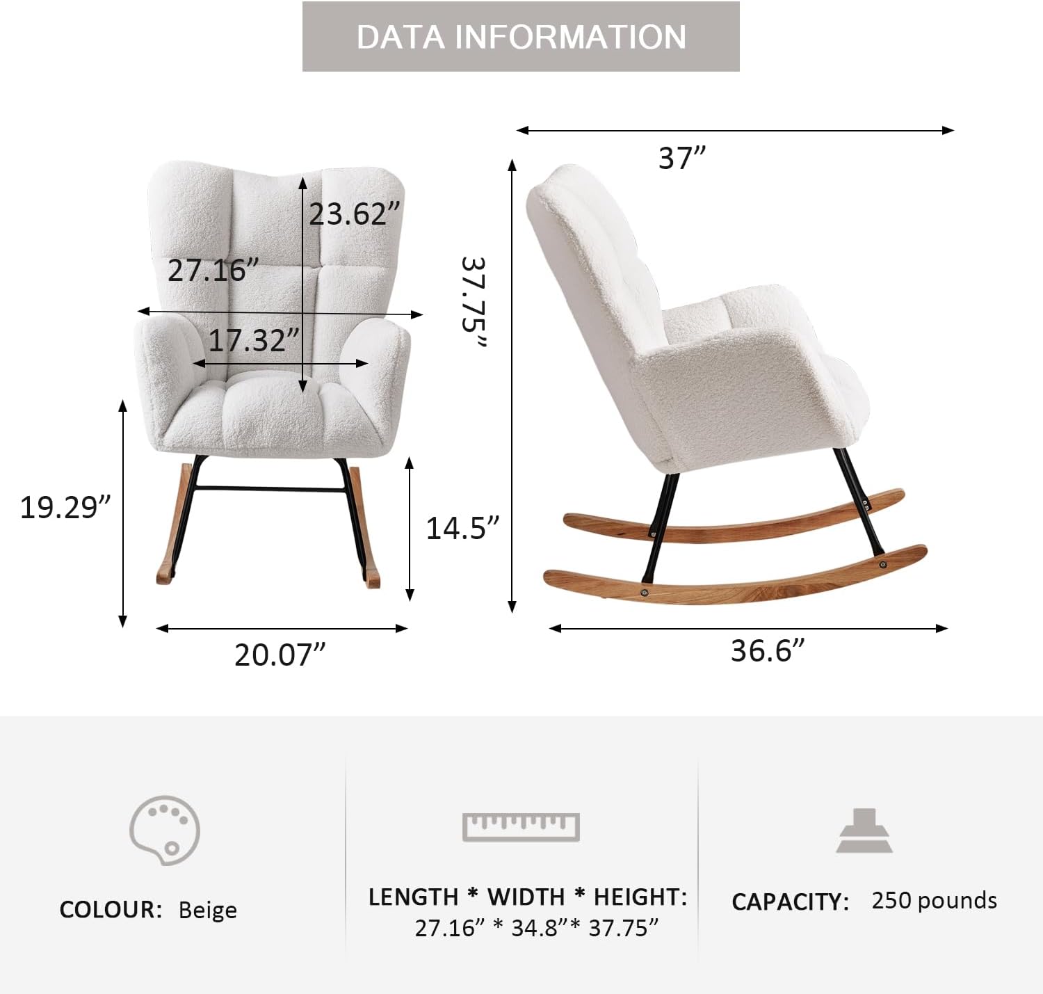 Nursery Rocking Chair, Teddy Upholstered Glider Rocker with High Backrest Armchair, Modern Rocking Accent Chairs for Nursery, Living Room, Bedroom, Offices (Ivory)