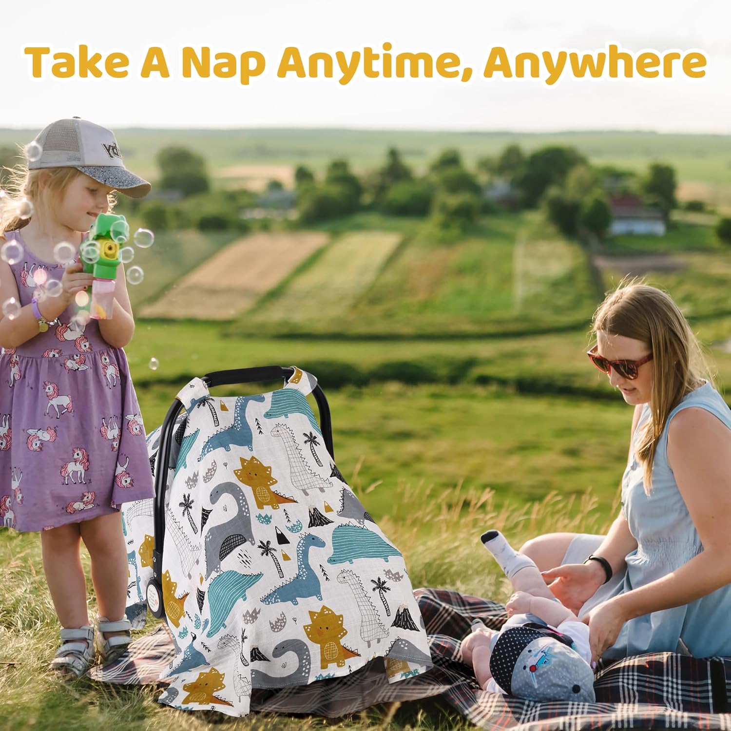 Rquite Dinosaurs Carseat Cover - Muslin Cotton Infant Car Seat Canopy, Breathable Baby Carrier Cover, Summer Stroller Sun Shade
