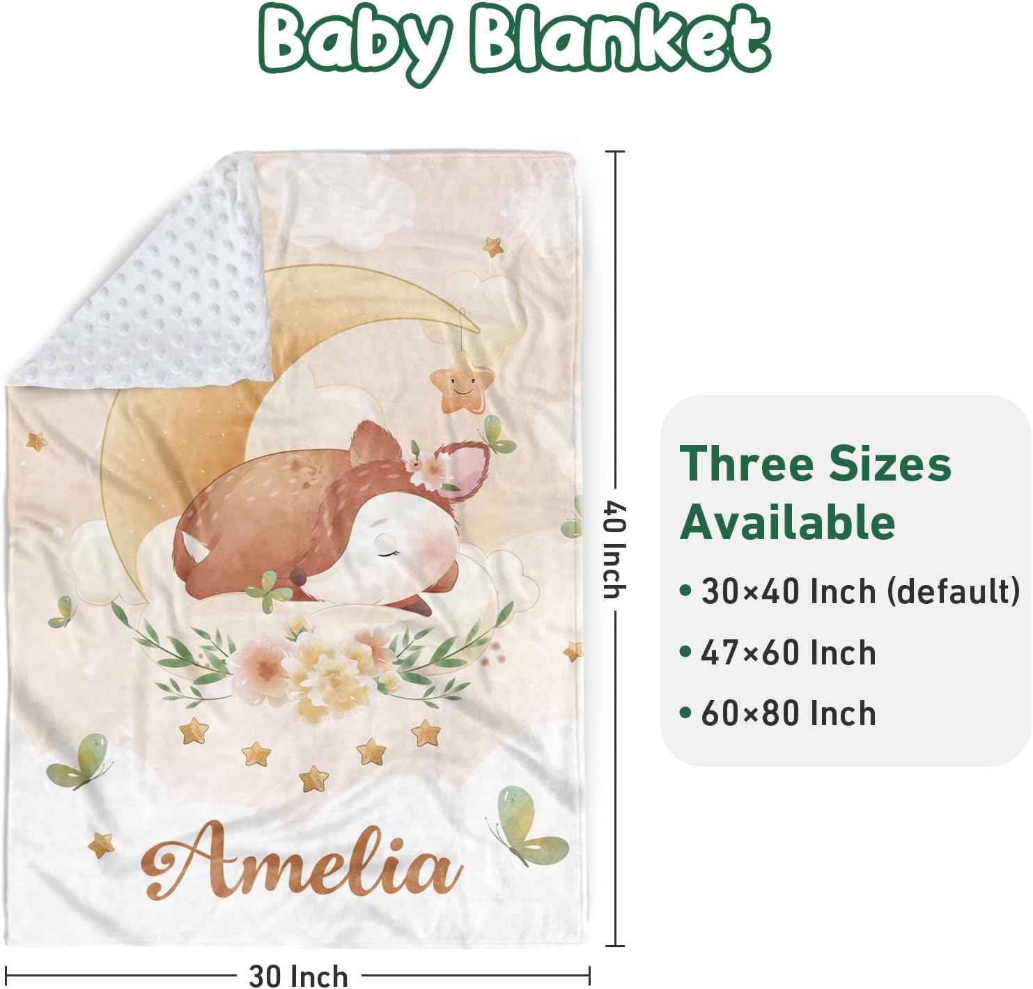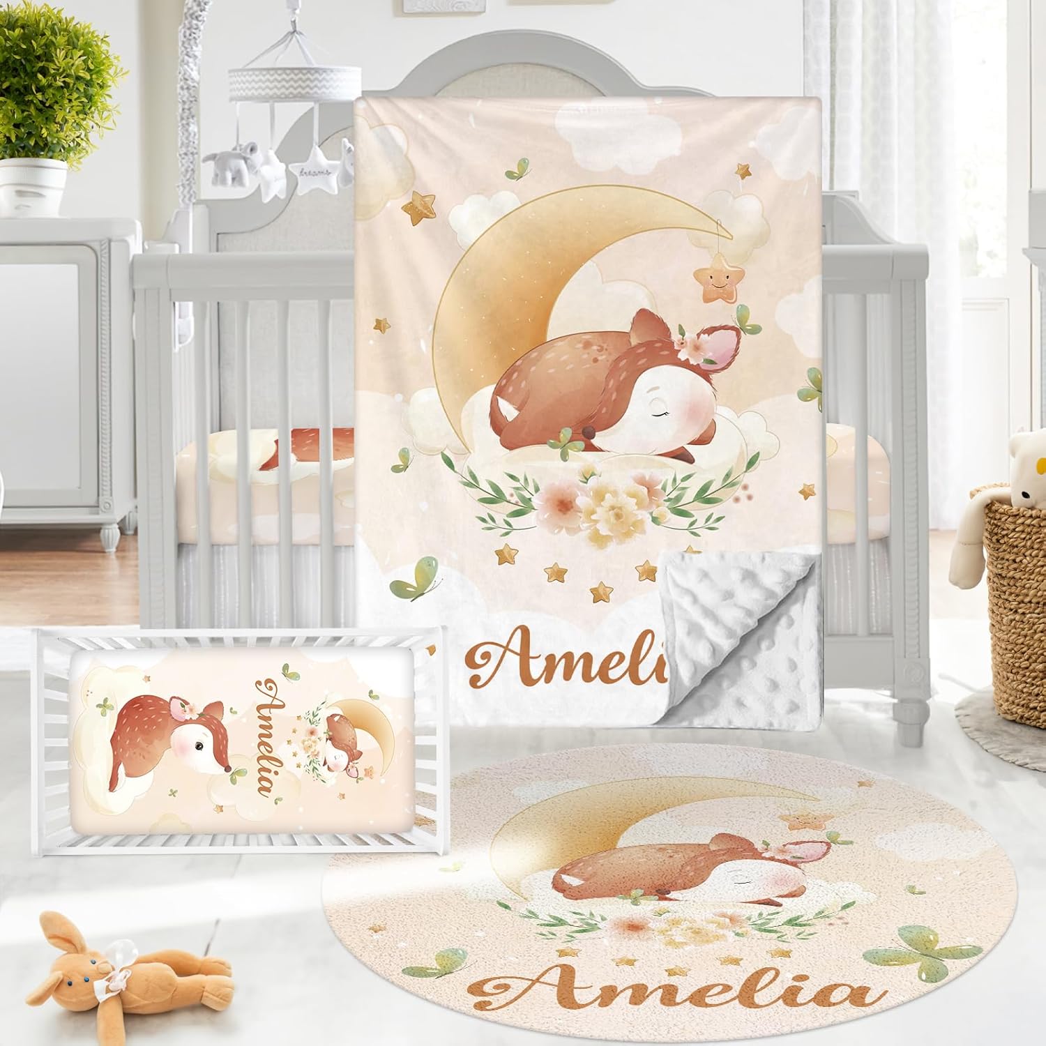 Personalized Baby Crib Bedding Set - Custom Name Fox Pattern 3 Pcs Set - Soft Blanket with Double Layer Dotted Backing, Fitted Sheet, Room Rug for Newborns Boys Girls Shower Gift