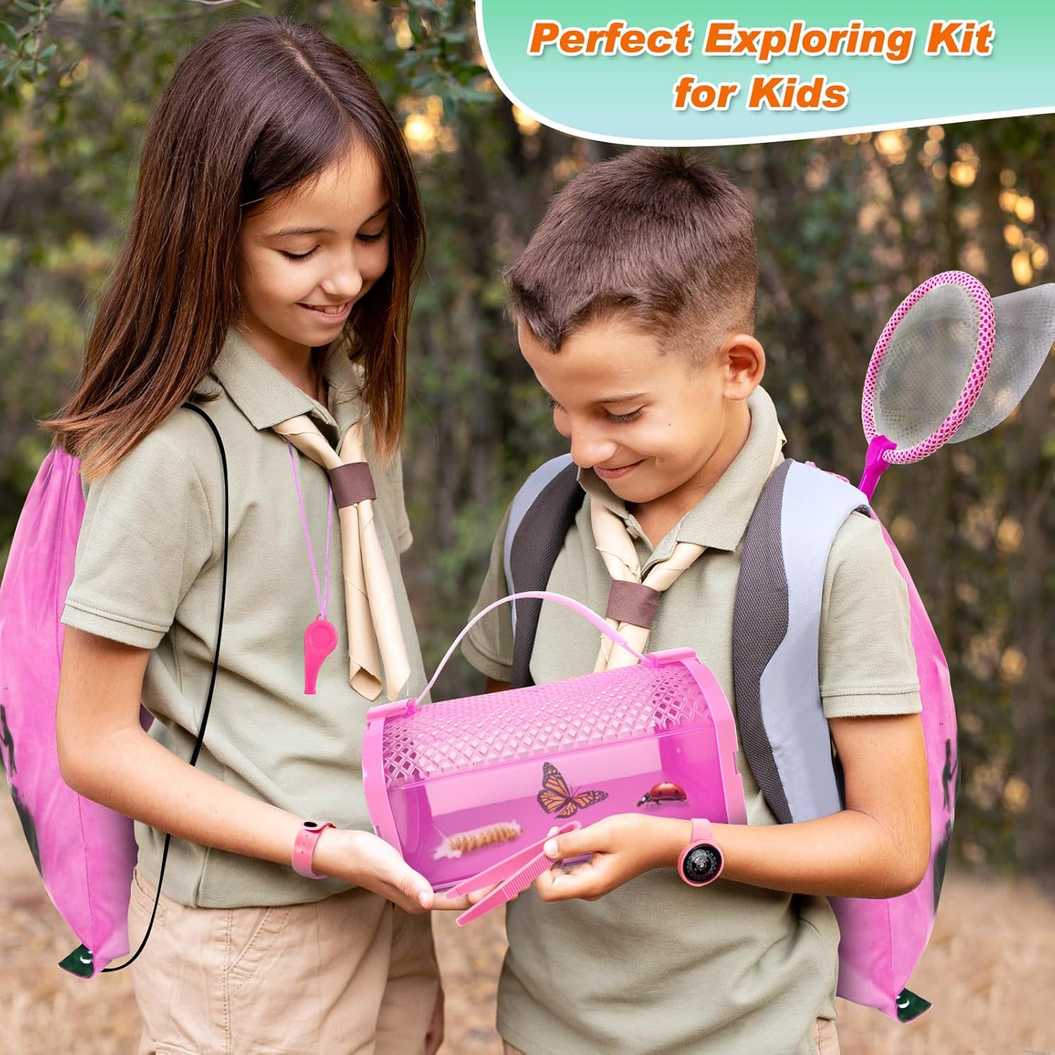 - Everything in One Box:This bug catching kit will fulfill all your child's needs for outdoor exploration, the explore kit comes with a high-quality Cage, Backpack, Flashlight, Toy Net, Tweezer, Magnifying Glass, Whistles, Compass Watch, Clamp and Bug Containers. Kids can always bring this gear ready to go and explore the mysteries of nature!