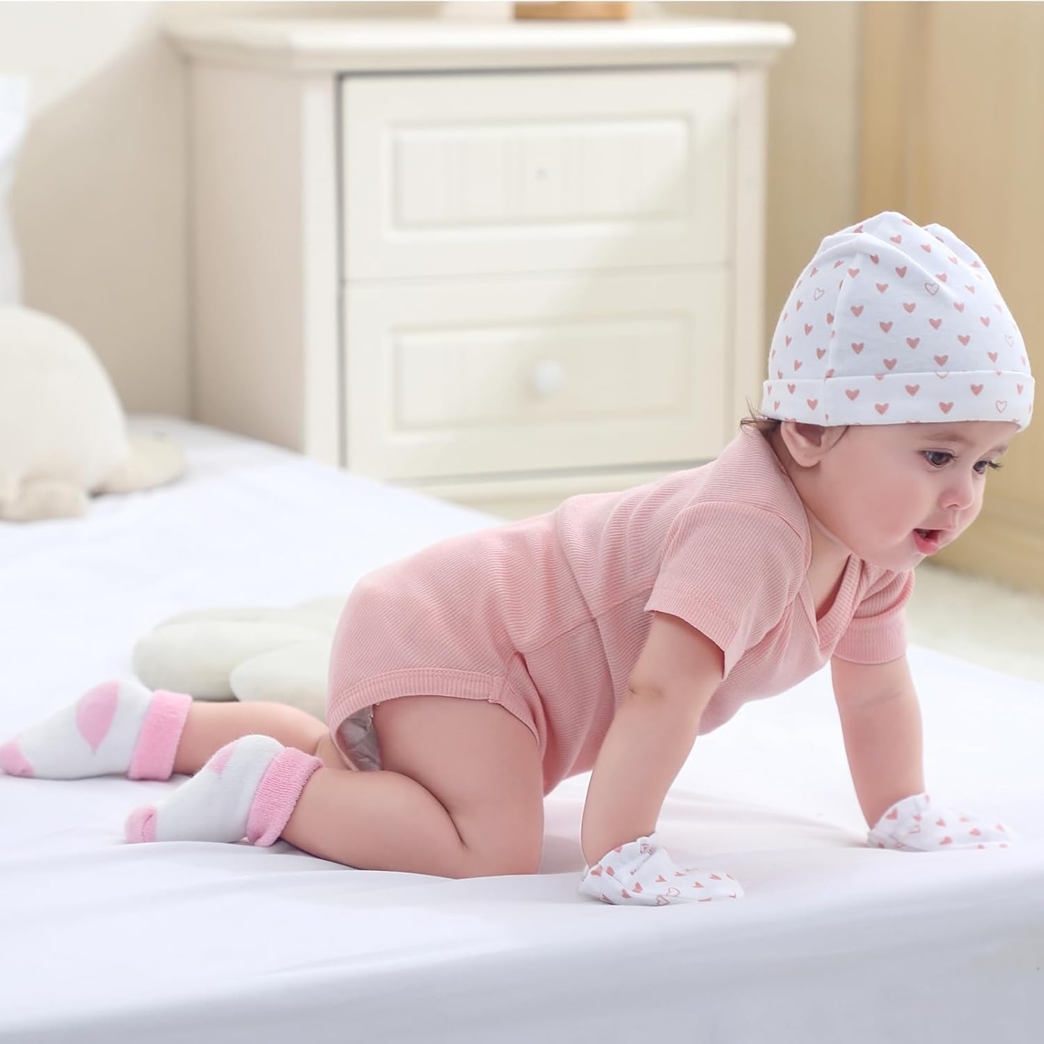 • Set Includes: 3-pack ribbed short-sleeve bodysuits, one ribbed snap-button romper, one 2-way zipper romper, 3 pairs of solid-colored pants, and 5 pairs of thick socks