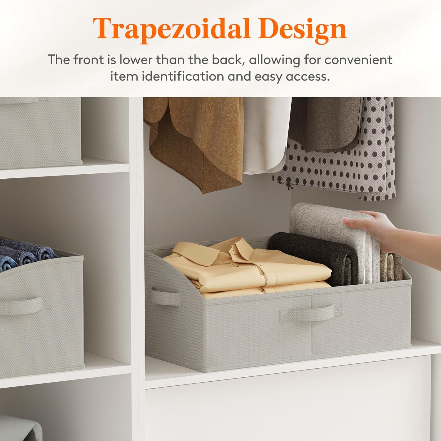 - Open Trapezoid Design: These storage baskets for shelves feature a trapezoidal design with the front lower than the back, providing an unobstructed view and making it easier to see and access items within the basket. This trapezoidal design enhances usability and accessibility, ensuring a clutter-free and organized storage solution.