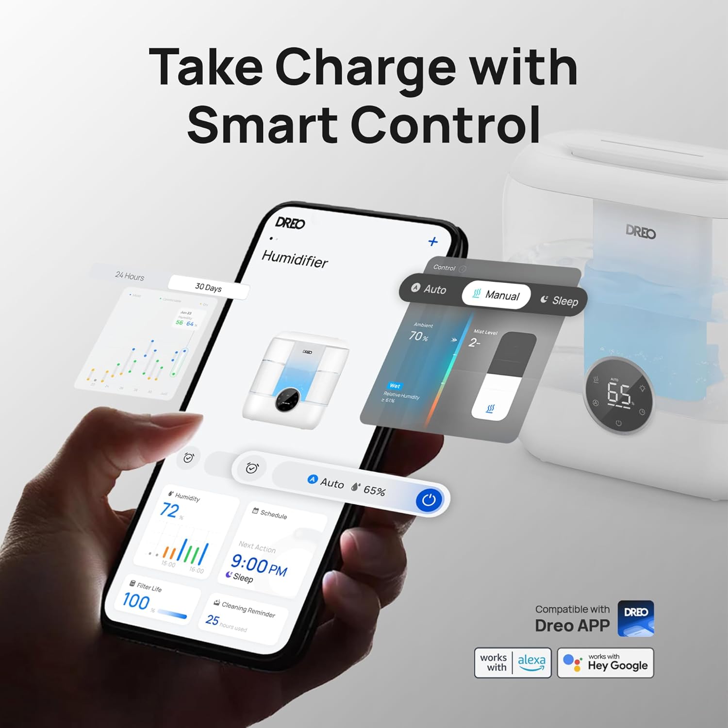 Dreo Smart Humidifiers for Bedroom, 6L Top Fill Supersized Cool Mist Humidifier for Large Room, 60 Hour Runtime, Quiet Ultrasonic Humidifiers for Plants, Baby, Indoor, Home, Night Light, White