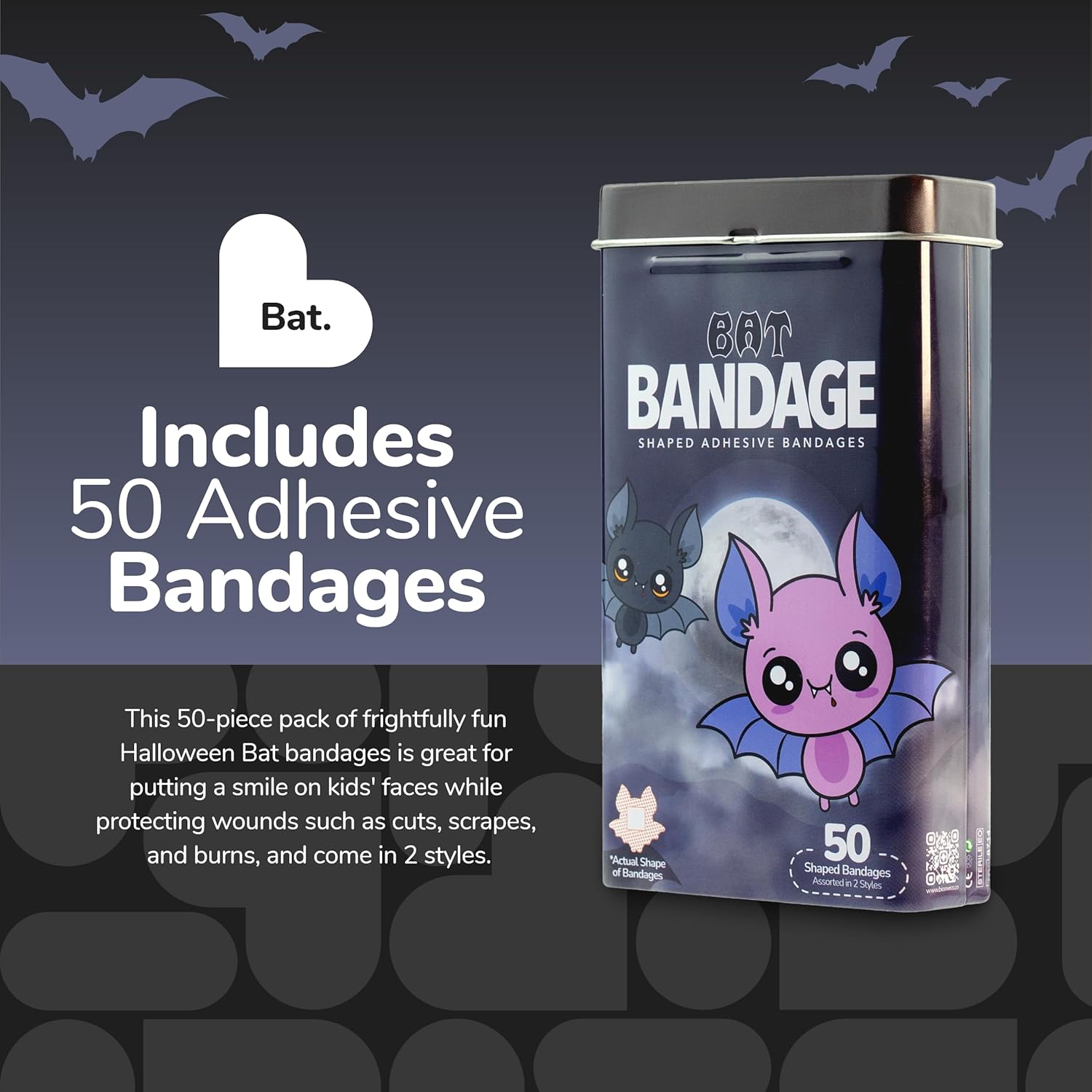 - BAT HALLOWEEN BANDAGES: This 50 piece tin of frightfully fun Halloween Bat bandages is great for putting a smile on kids' faces while protecting wounds such as cuts, scrapes, and burns, and come in 2 styles; sticky bandages are perfect for kids and adults alike, and also for school nurses and pediatric doctors