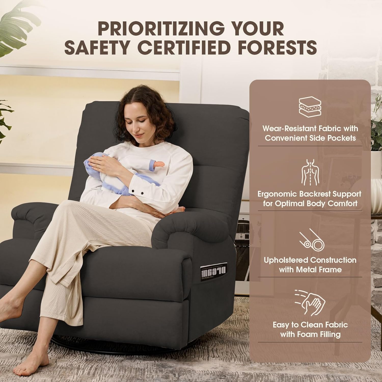 - GLIDER RECLINER: This chair swivels 360 degrees and glides smoothly, offering a gentle rocking motion when the footrest is closed, ideal for bonding moments between mom and baby.
