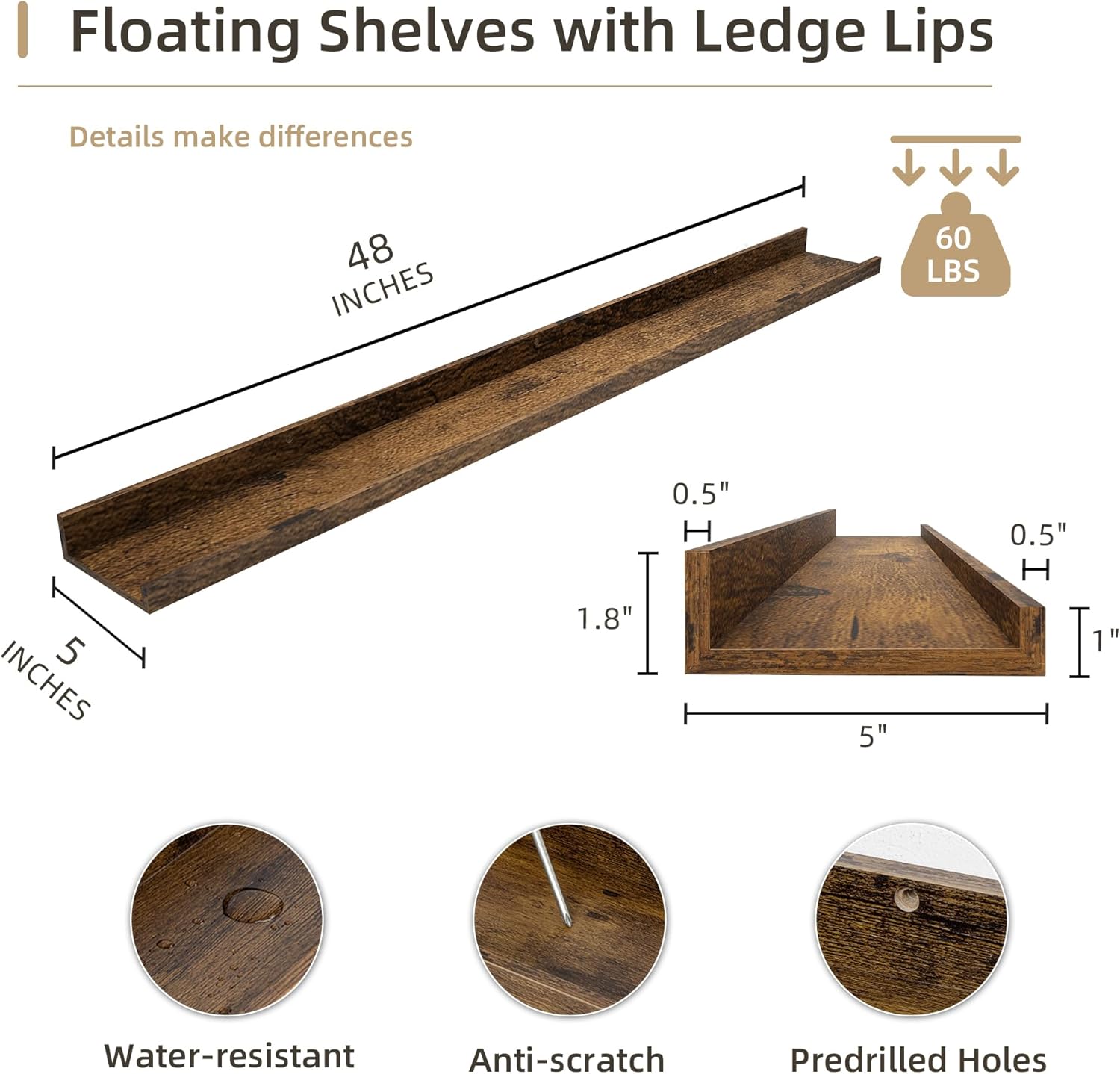 Picture Ledge Shelf, Wood Long Floating Shelves for Wall, Set of 2, 48 inch Picture Ledge Shelves, Photo Ledge Nursery Book Shelves Wall Mounted for Living Room Kids' Room Bedroom, Color Brown