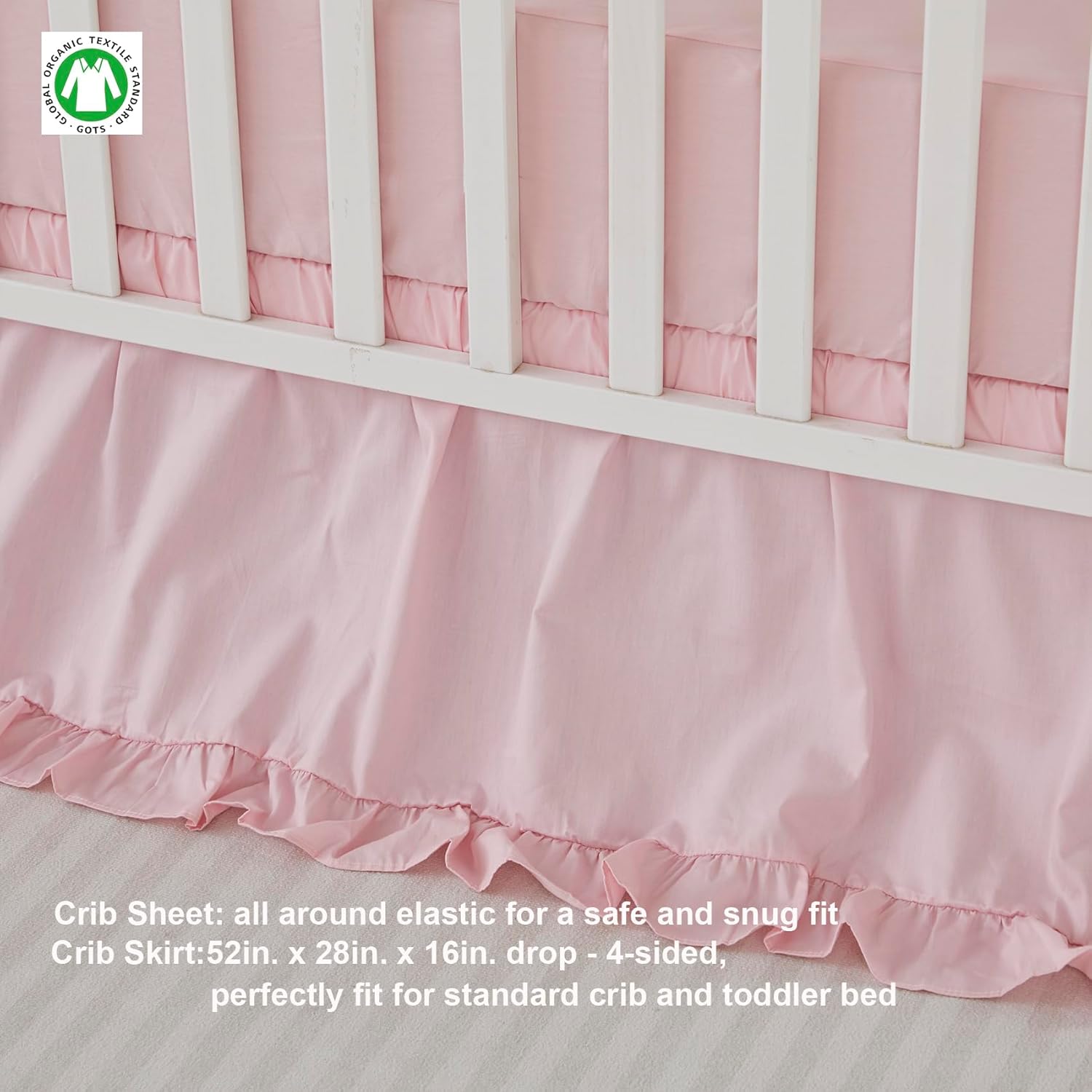 - 3-piece pink ruffles Crib Bedding Set for Girls or Boys Includes: Crib Comforter, Fitted Crib Sheet, Crib Bed Skirt