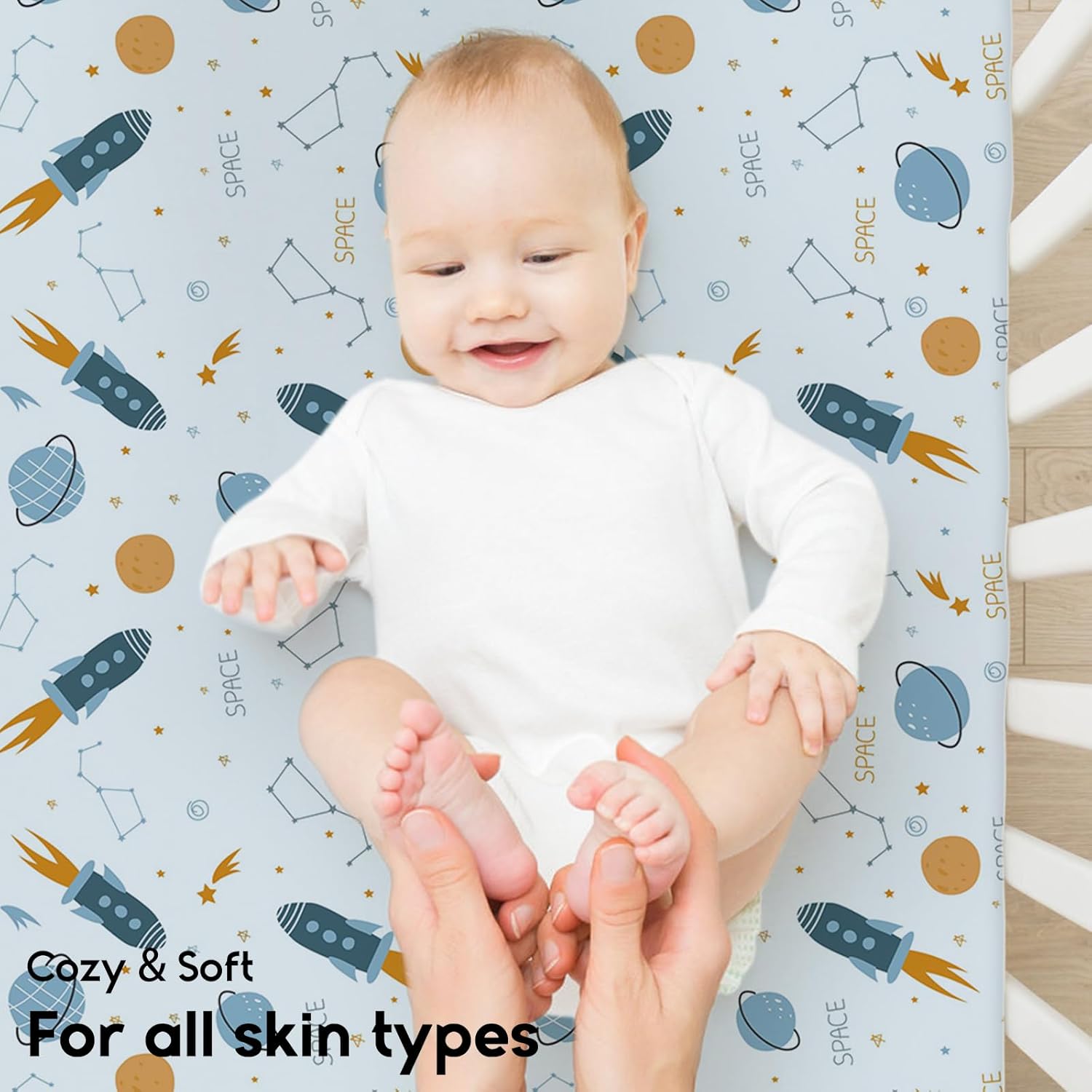 Yoofoss Pack and Play Sheets Fitted, Mini Crib Sheets 2-Pack for Pack N Play Mattress, Stretchy Playard Sheet, Soft and Breathable Blue Rocket