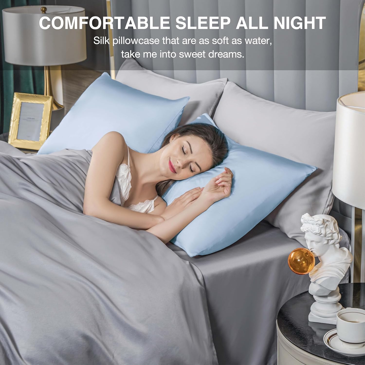 Mulberry Silk Pillowcase for Hair and Skin,Cooling Silk Pillow Case with Hidden Zipper,Allergen Proof Dual Sides Soft Breathable Smooth Silk Pillow Cover for Women (Light Blue,Body)