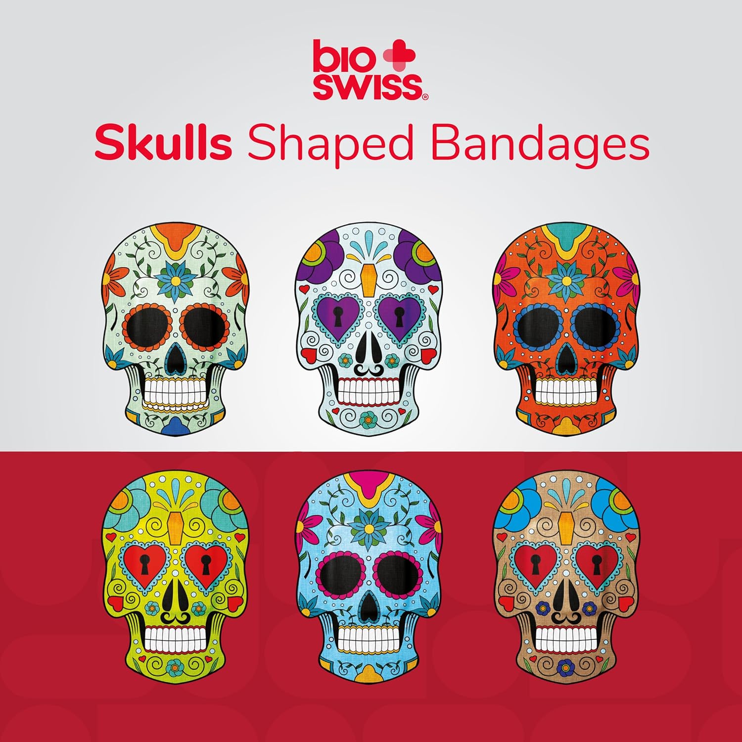 BioSwiss Bandages, Sugar Skull Shaped Self Adhesive Bandage, Latex Free Sterile Wound Care, Fun First Aid Kit Supplies for Kids, 24 Count