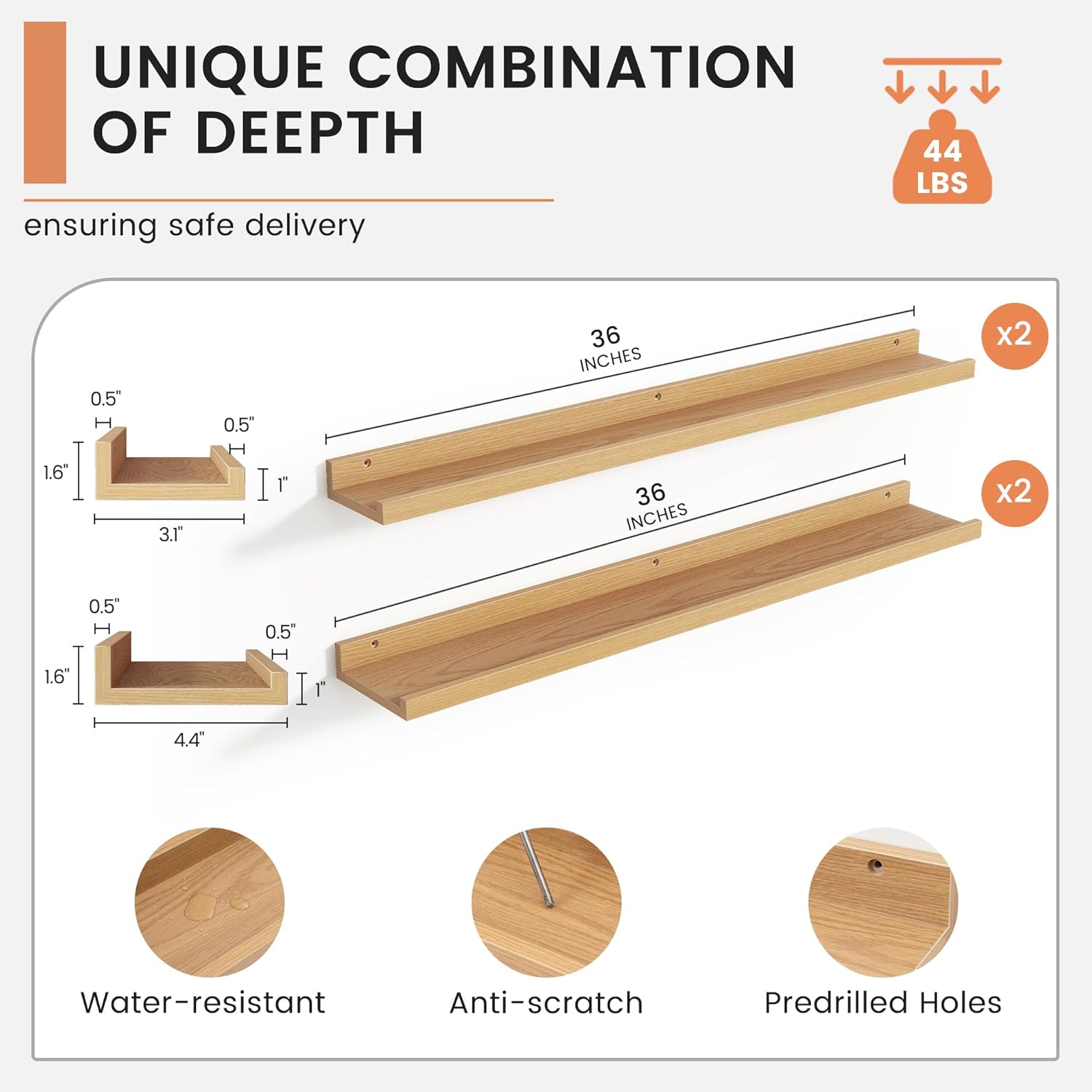 Floating Picture Ledge Shelves Set of 4, 36 Inch Shelves with Lip - Large Nursery Book Shelf for Toys Storage, Kids Bookshelf - Wall Mounted Living Room Bedroom Decor Frames