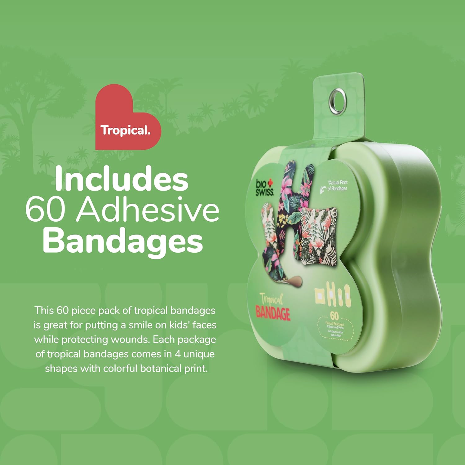 BioSwiss Bandages, Assorted Size Tropical Print Self Adhesive Bandage, Latex Free Sterile Wound Care, First Aid Kit Supplies for Kids and Adults, 60 Count