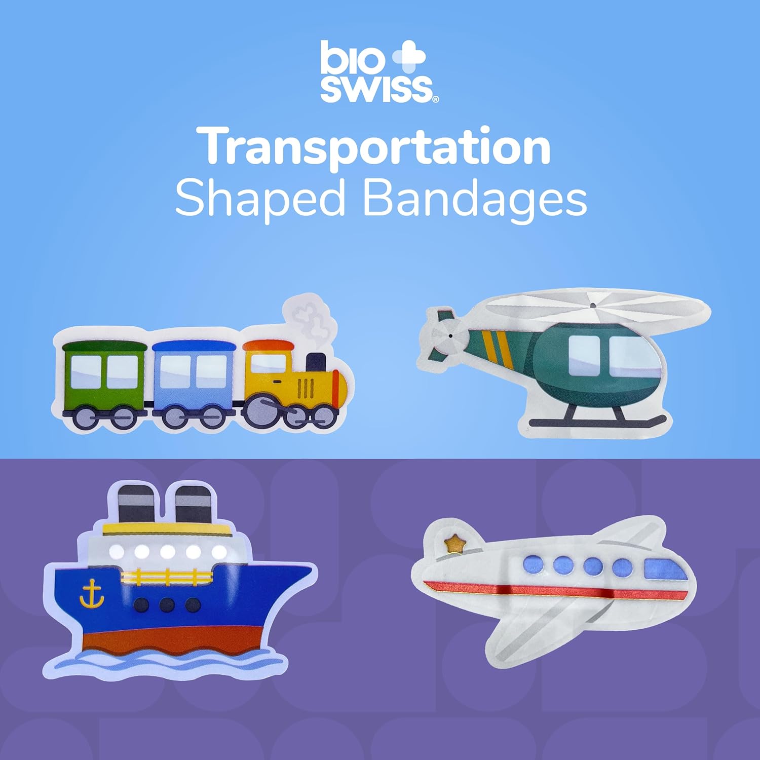 - TRANSPORTATION BANDAGES: This 50 piece pack of adorable vehicle shaped bandages is great for putting a smile on kids' faces while protecting wounds such as cuts, scrapes, and burns and comes in an assortment of boat, airplane, train, and helicopter shapes; sticky bandages are perfect for kids and adults alike, and also for school nurses and pediatric doctors