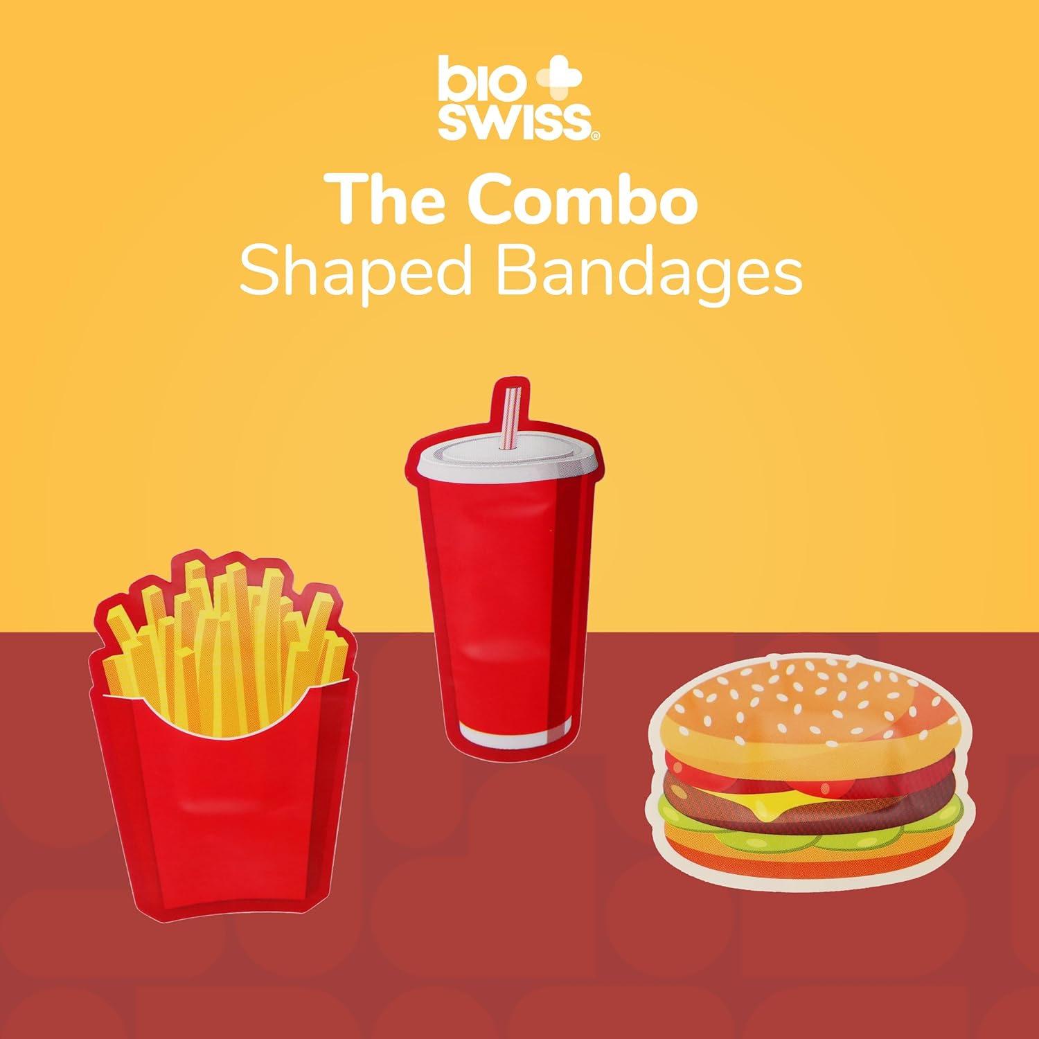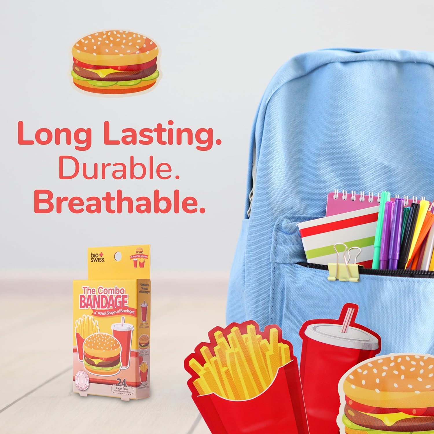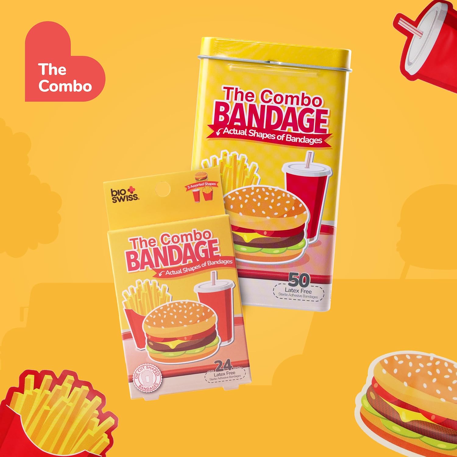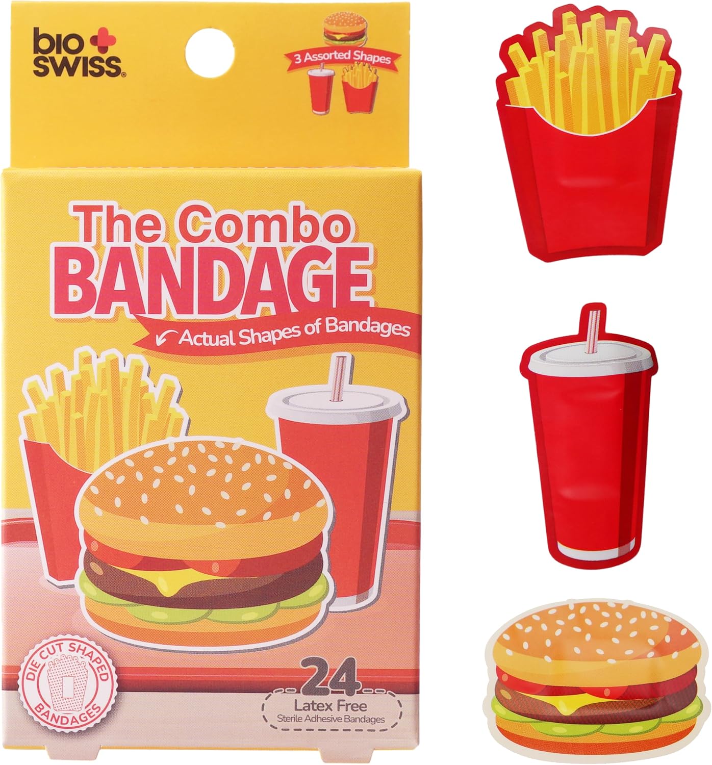 - COMBO MEAL BANDAGES: This 24 piece pack of adorable fast food shaped bandages is great for putting a smile on kids' faces while protecting wounds such as cuts, scrapes, and burns and comes in an assortment of french fries, burgers, and soda shapes; sticky bandages are perfect for kids and adults alike, and also for school nurses and pediatric doctors