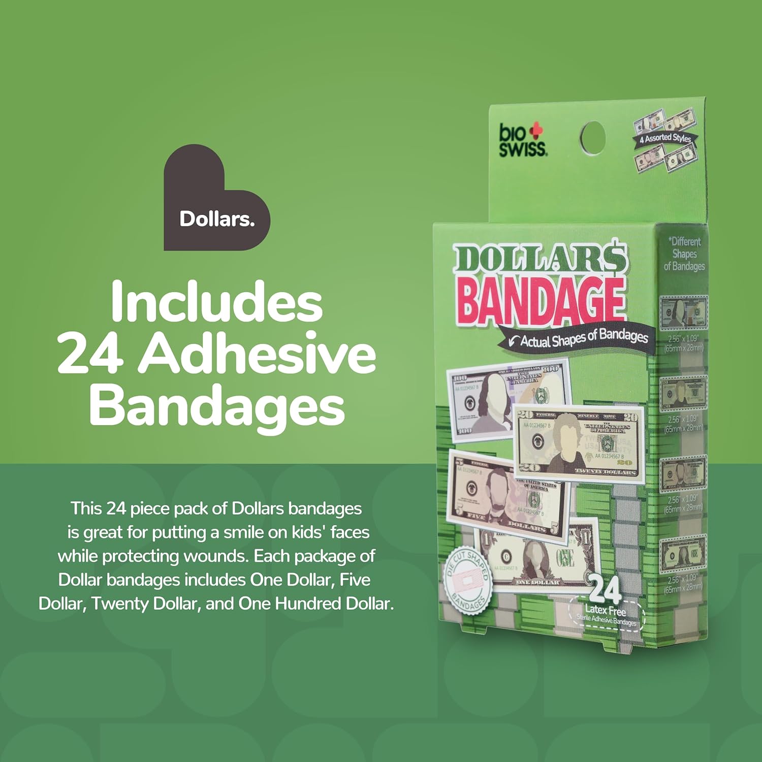 BioSwiss Bandages, Money Shaped Self Adhesive Bandage, Latex Free Sterile Wound Care, Fun First Aid Kit Supplies for Kids, 24 Count