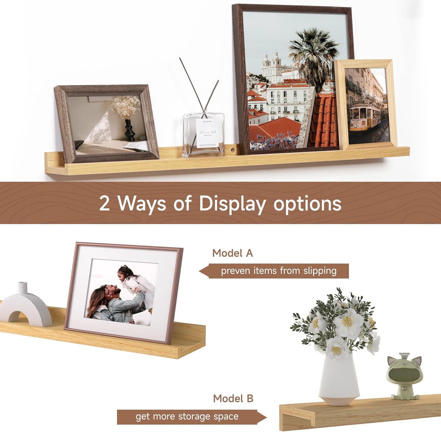 - MEMORIES SHOWCASE SHELF: Do you have a lot of memorable photos, but don't know how to display them, Fun Memories picture ledge shelves (especially in large sizes) are perfect for you to display them! With our hanging racks, you can store and display different types and sizes of photo frames in one place without worrying about