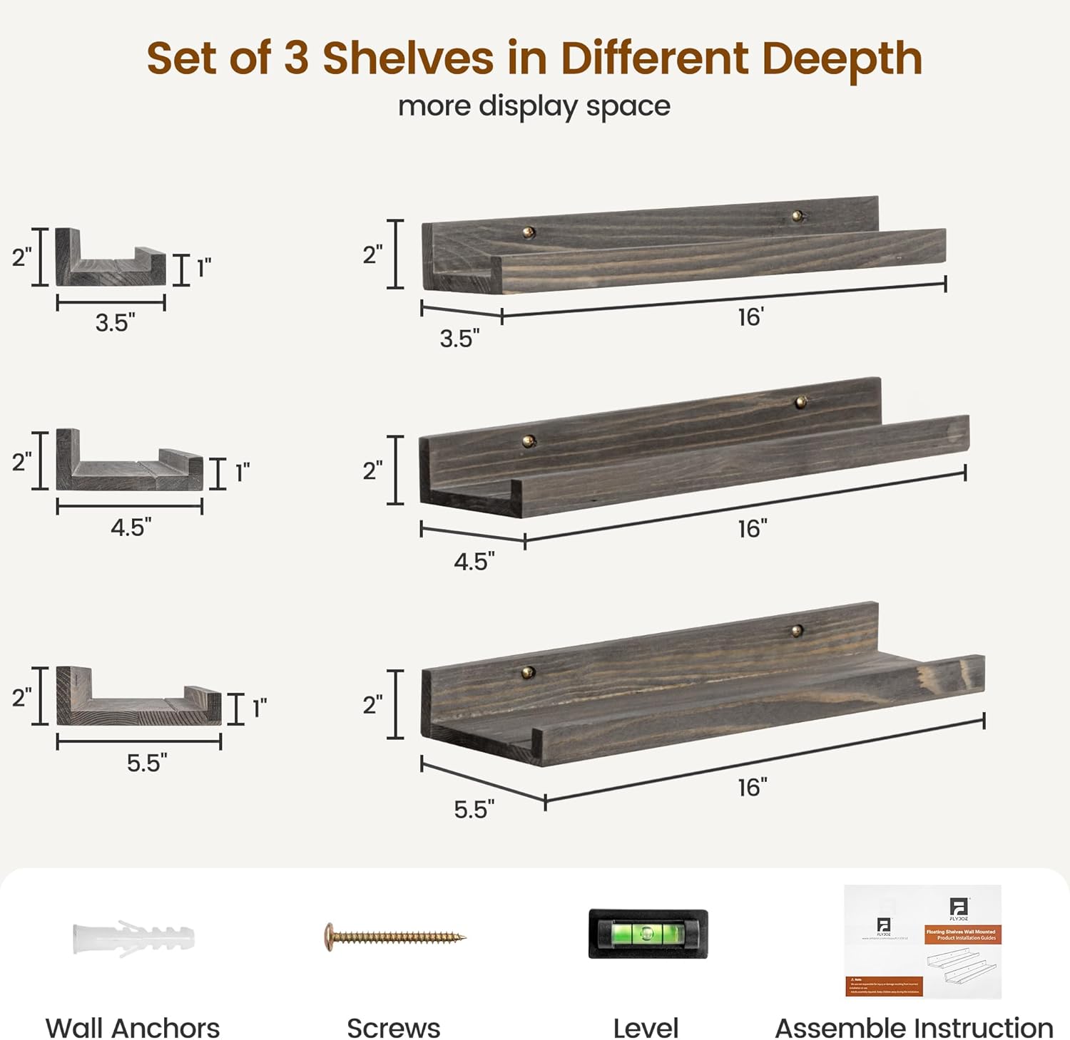 Picture Ledge Wall Shelves 16 inches Width Set of 3, Solid Pine Wood Rustic Floating Ledge Shelves for Wall for Kids' Room Bedroom Kitchen Bathroom Living Room Nursery Display Decor, Grey