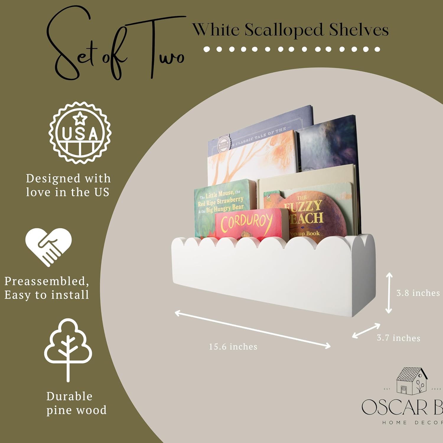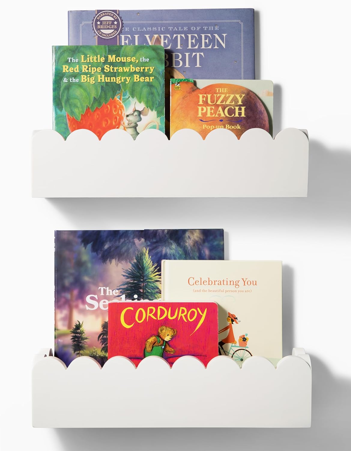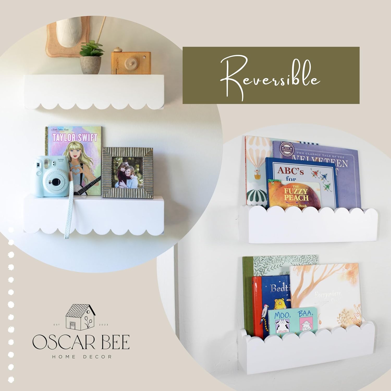 - 𝗖𝘂𝘀𝘁𝗼𝗺𝗶𝘇𝗲 𝘁𝗼 𝗬𝗼𝘂𝗿 𝗡𝘂𝗿𝘀𝗲𝗿𝘆: Featuring a reversible scalloped design, this kids wall bookshelf fits perfectly in baby rooms, whether as traditional nursery shelves for wall or floating book shelves for wall nursery. Easily customize for girls room shelves, nursery bookshelf wall, or shelves for nursery girl or boy themes