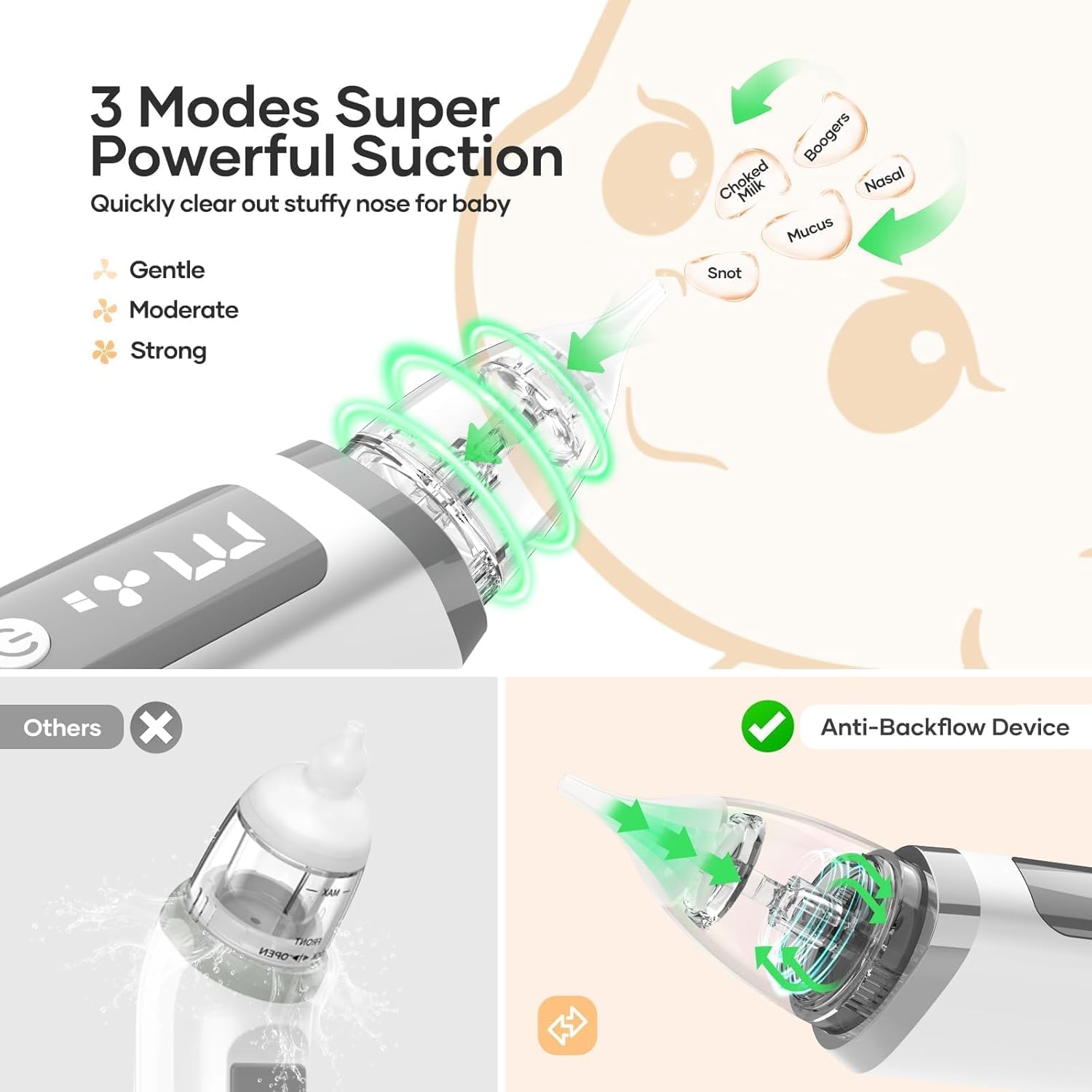 - 3 LEVELS OF SUCTION MODES - The nasal aspirator for baby has three levels of adjustable suction modes from weak to strong, quickly removes different types of nasal secretions (Choking milk, snot, etc)