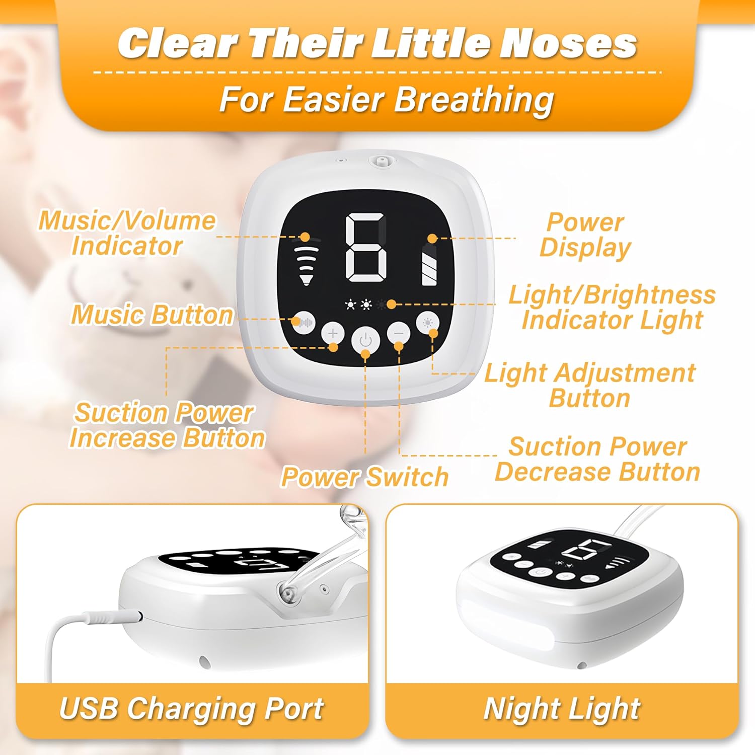 - [Soothing Functions]: Features a lullaby and soothing night light to create a calming environment during nasal aspiration for your baby. 3 brightness night light and 4 levels of lullaby volume adjustment.