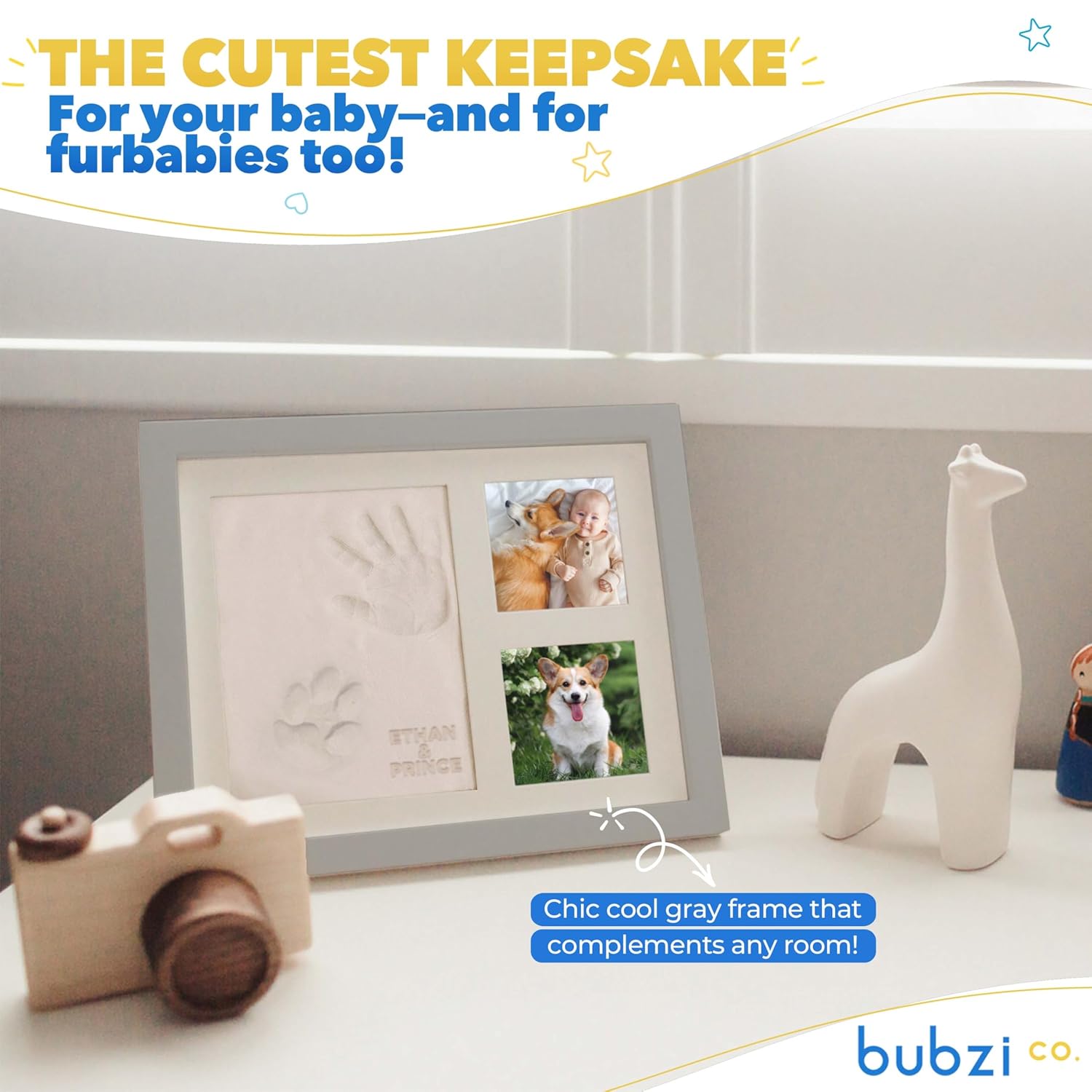 - EASY TO USE FOR BABY AND PETS The Bubzi co baby keepsake frame is designed with you in mind. Even with the tiniest, wiggliest, fingers and toes, you can flawlessly capture your newborn's handprint, footprint ( or even paw print ). Simply press their tiny hand or foot into the soft, air-drying clay to capture a precious imprint you will cherish forever!