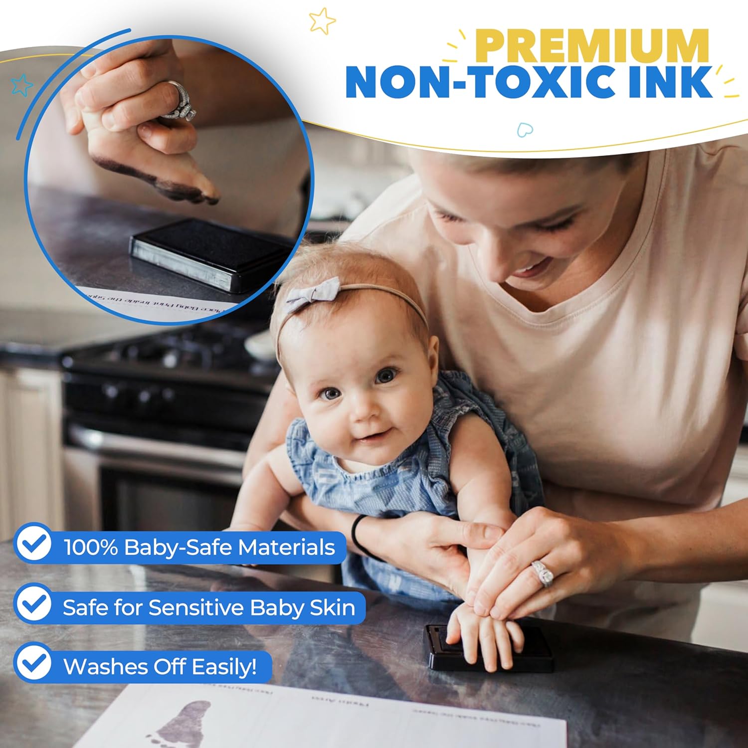 - Easy to Use & 100% Baby Safe: Rest assured that our baby ink hand & footprint kit is 100% safe for your little one. The ink for baby handprint & footprints in our kit has a bigger โinkerโ ink pad to really define the cute lines of your babyโs hand & foot.