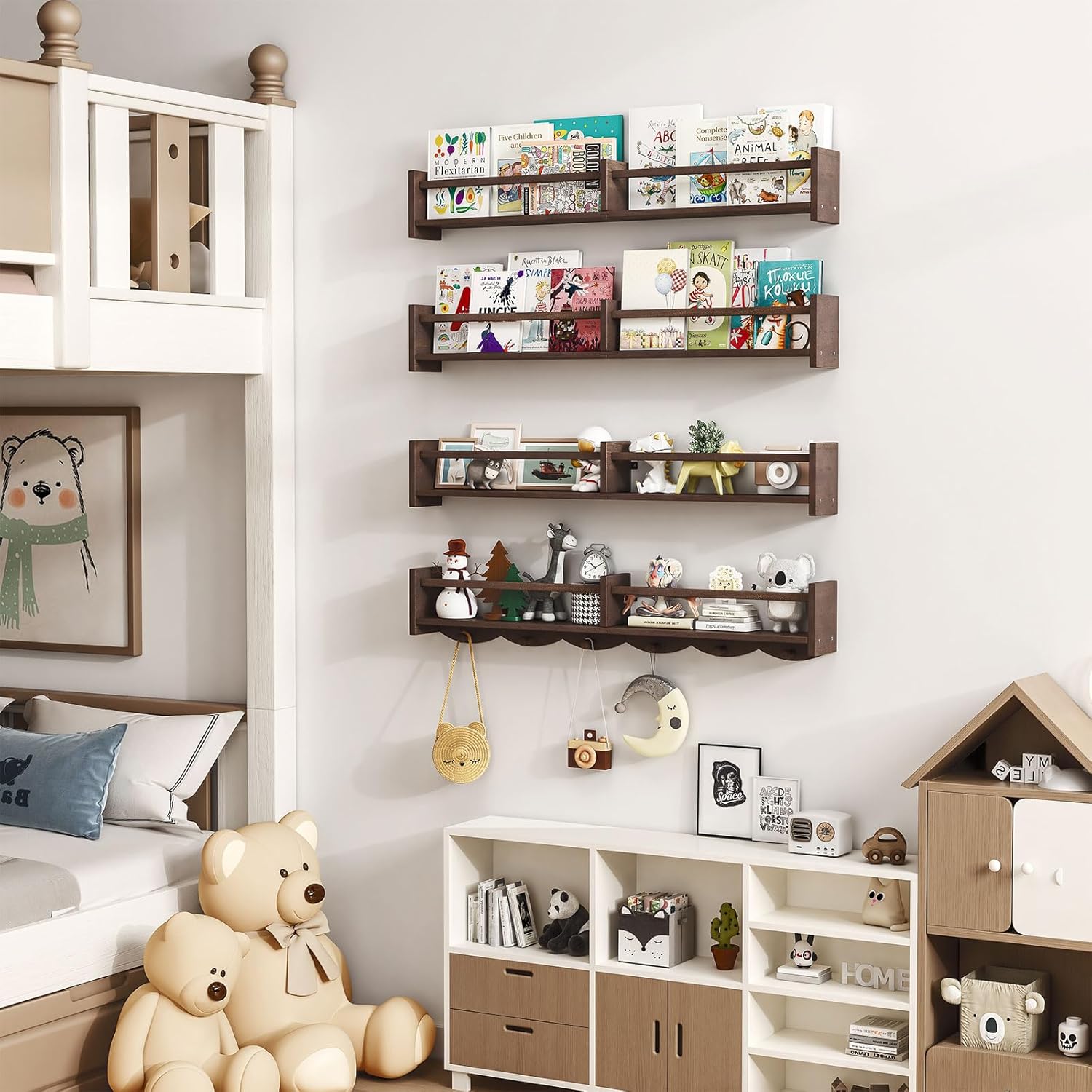 34Inch Nursery Bookshelves,Set of 4,Wall Floating Shelf Kids Coat Rack with 6Hooks,Hanging Book Shelf for Baby Nursery Room Décor (Dark Brown, 34)