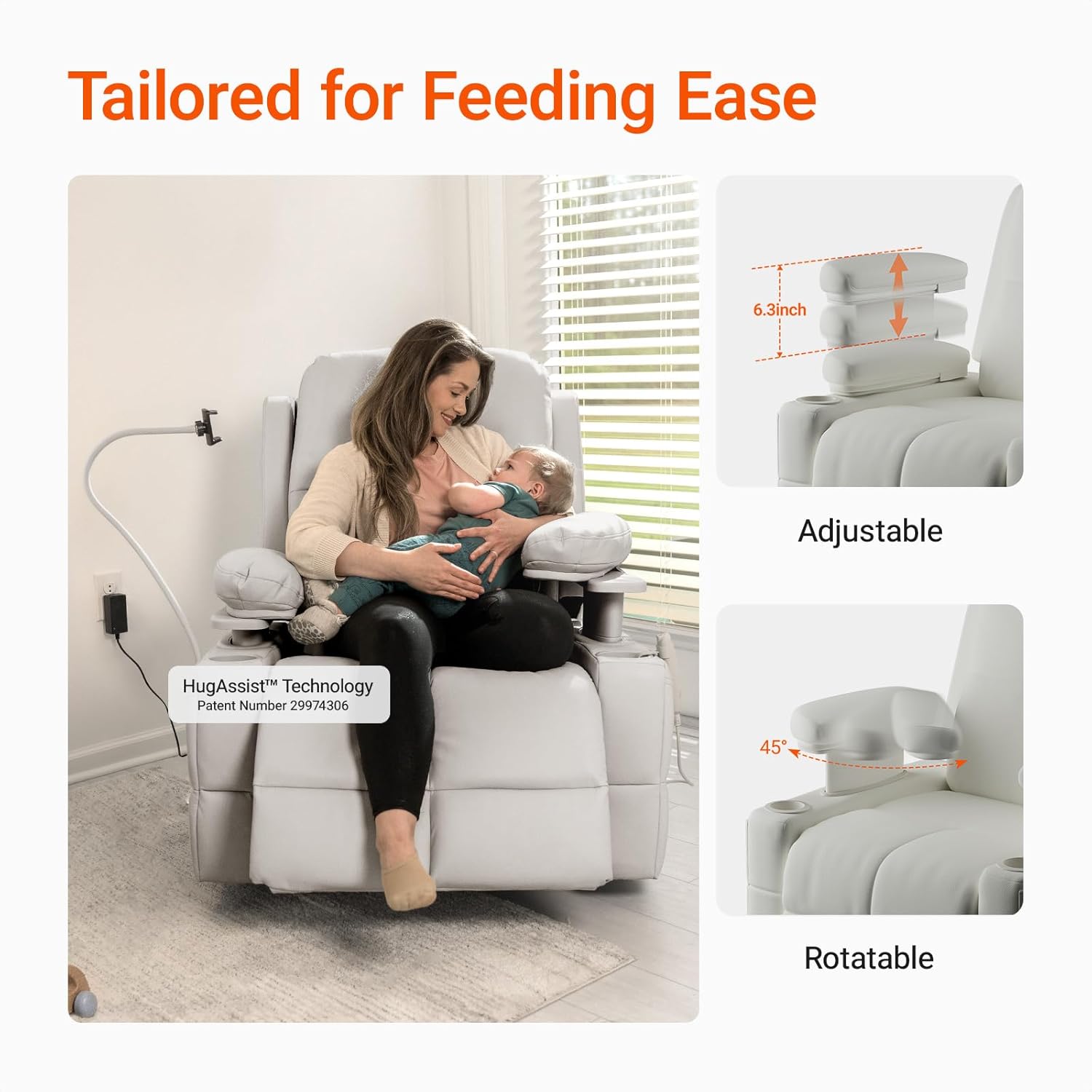 - Perfect for nursing & soothing baby: This glider rocking chair features unique and proprietary HugAssist ergonomic armrests that adjust up and down and rotate for superior support, reducing shoulder and back strain during nursing. A must-have rocking chair nursery essential, it creates a cozy space for breastfeeding while helping soothe your baby to sleep. The smooth 30° rocking and 270° swivel motion allow effortless movement, making late-night feedings easier. Whether as a nursery rocking chair for bonding or a swivel recliner chair for relaxation, it's the perfect addition to any baby's room.