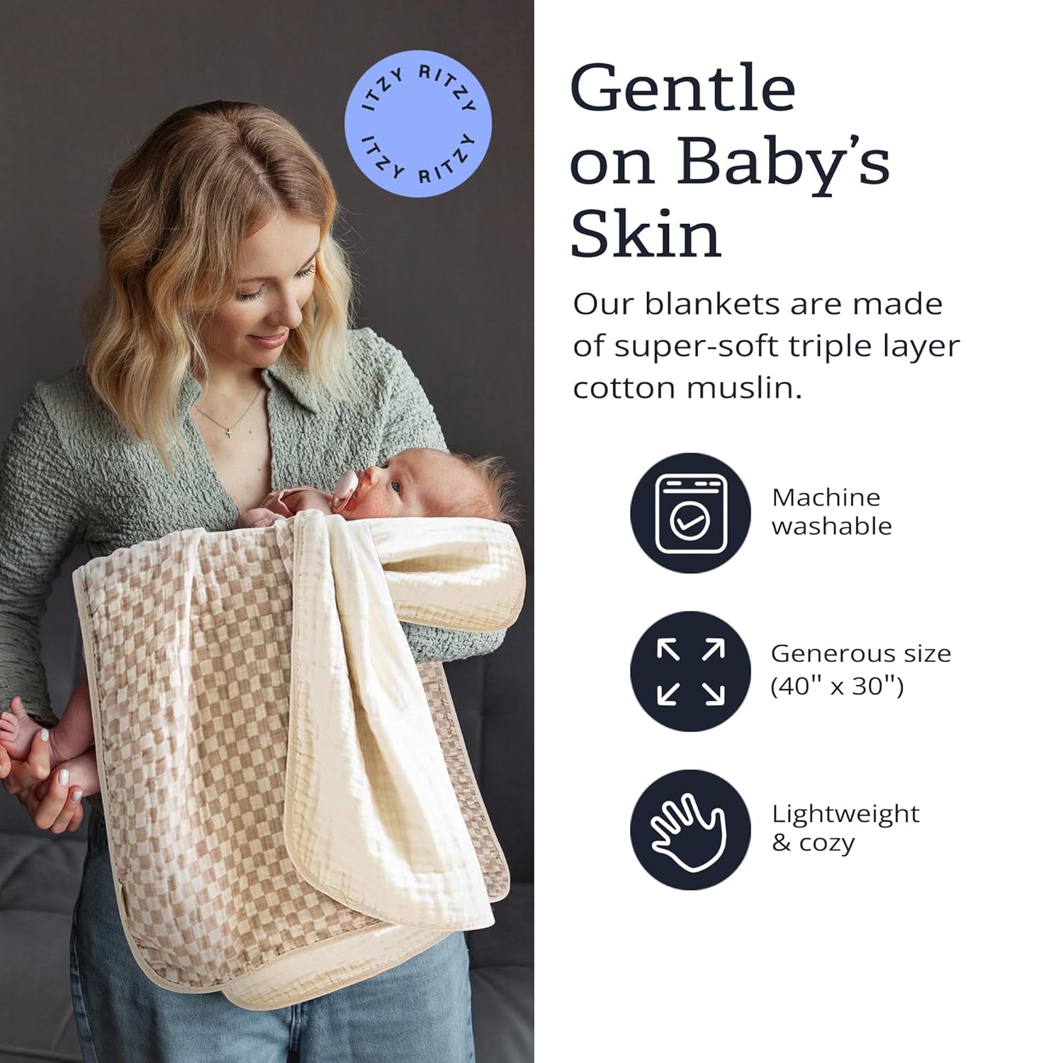 Itzy Ritzy Baby Blanket – Soft Cotton Muslin Multi-Use Blanket - Can Be Used as a Tummy Time Mat, Nursing Cover, Stroller Shade & More – Measures 30" x 40", Machine Washable (Checkerboard)