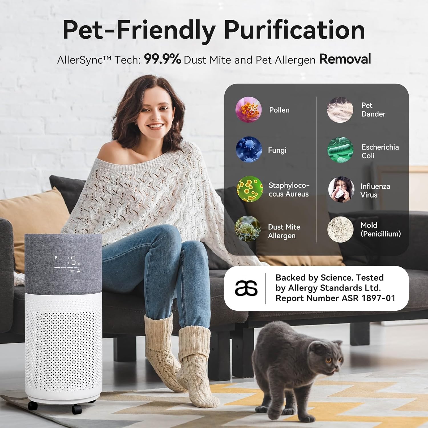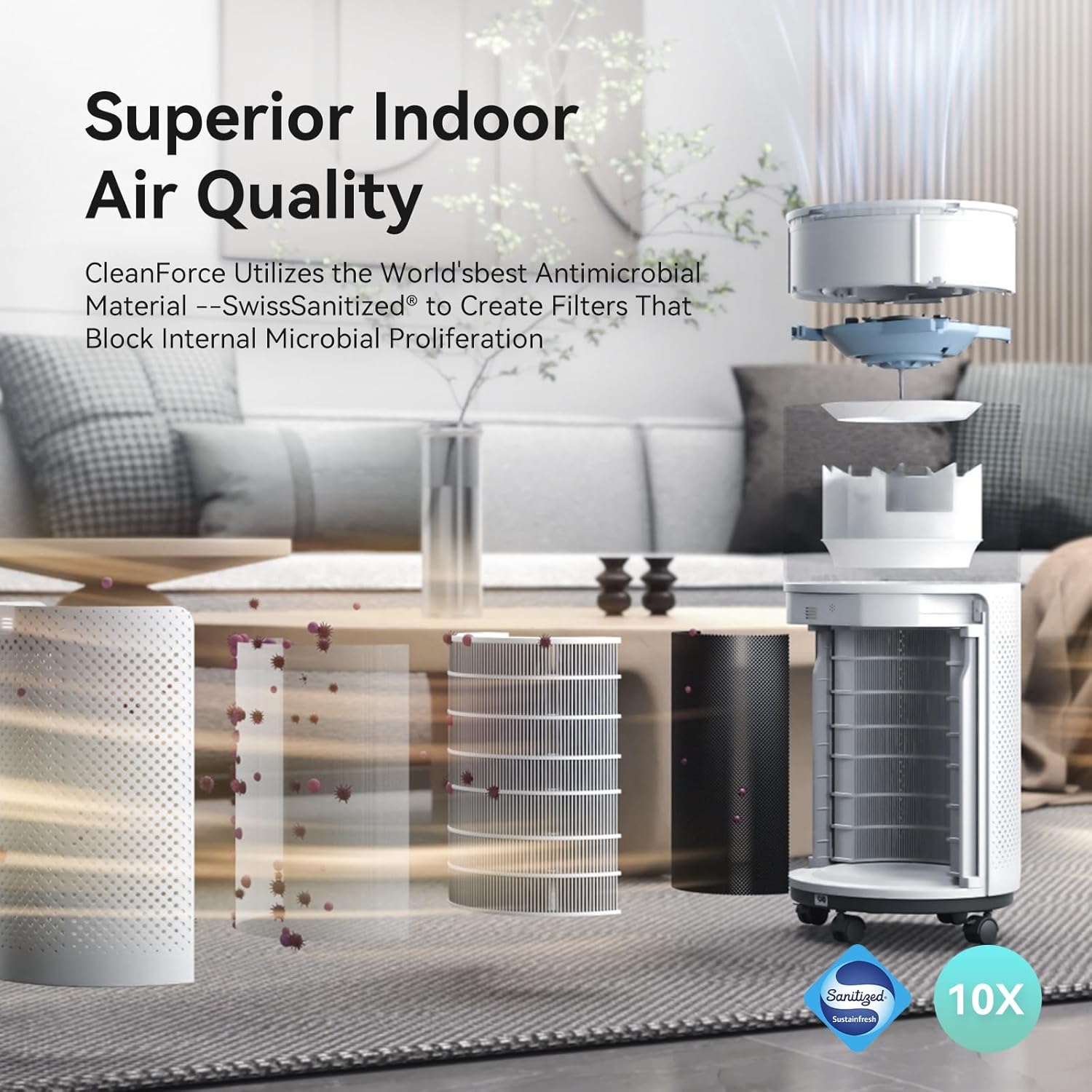 - Advanced Allergy Relief: Enjoy cleaner air with this asthma and allergy friendly air purifier, designed to effectively reduce dust mite allergens and pet dander. Improve your indoor air quality for a healthier living environment. Benefit from its self-sterilizing feature, which uses Swiss Sanitized antimicrobial materials to eliminate secondary pollution, making it ten times more effective than H13 HEPA filters and surpassing H14 HEPA standards