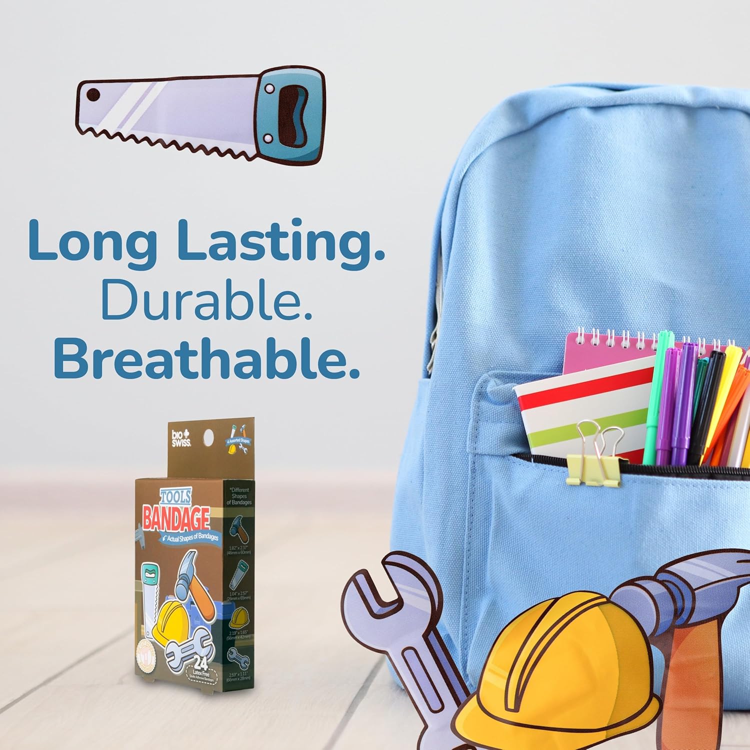 - TOOLS BANDAGES: This 24 piece pack of tool shaped bandages features 4 fun tool shapes (hard hat, saw, wrench, and hammer), and is great for putting a smile on kids' faces while protecting wounds such as cuts, scrapes, and burns; sticky bandages come in a cute cardboard box and are perfect for kids and adults alike, and also for school nurses and pediatric doctors