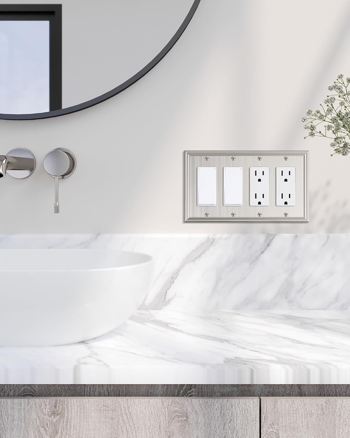 2-Pack Quad Decorator Outlet Cover Plate, Zinc Alloy Brushed Nickel Switch Plates and Outlet Covers, 4 Gang Wall Plates for Electrical Outlets, Receptacle, GFCI Outlet, Dimmer Switch