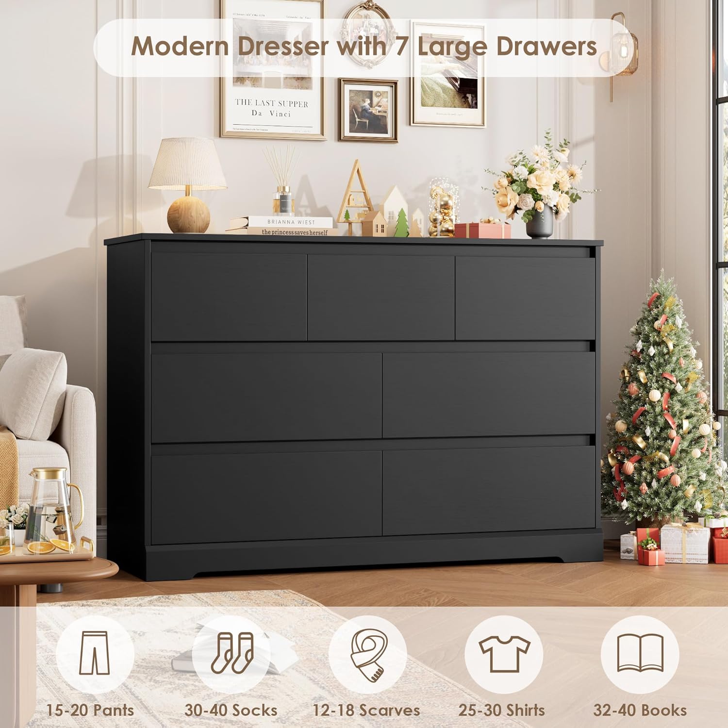 Dresser for Bedroom, Modern Black Dresser, Wood Chest of Drawers Nursery Dressers, with Storage, 7 Drawer Double with Handle Free, Large Storage Organizer for Living Room,White