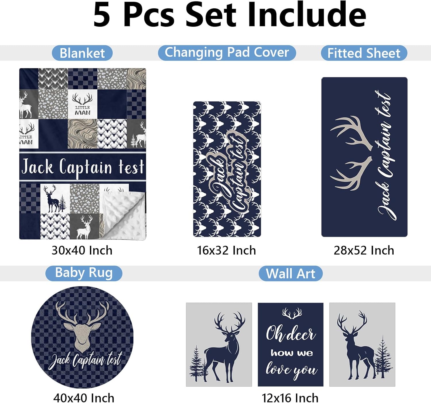 Personalized Baby Bedding Set, 5 Pcs Custom Name Crib Bedding Set, Double Layer Blue Nursery Bedding Set for Baby Boys, Woodland Deer Baby Crib Set, Gifts for Toddlers Infants New Parents