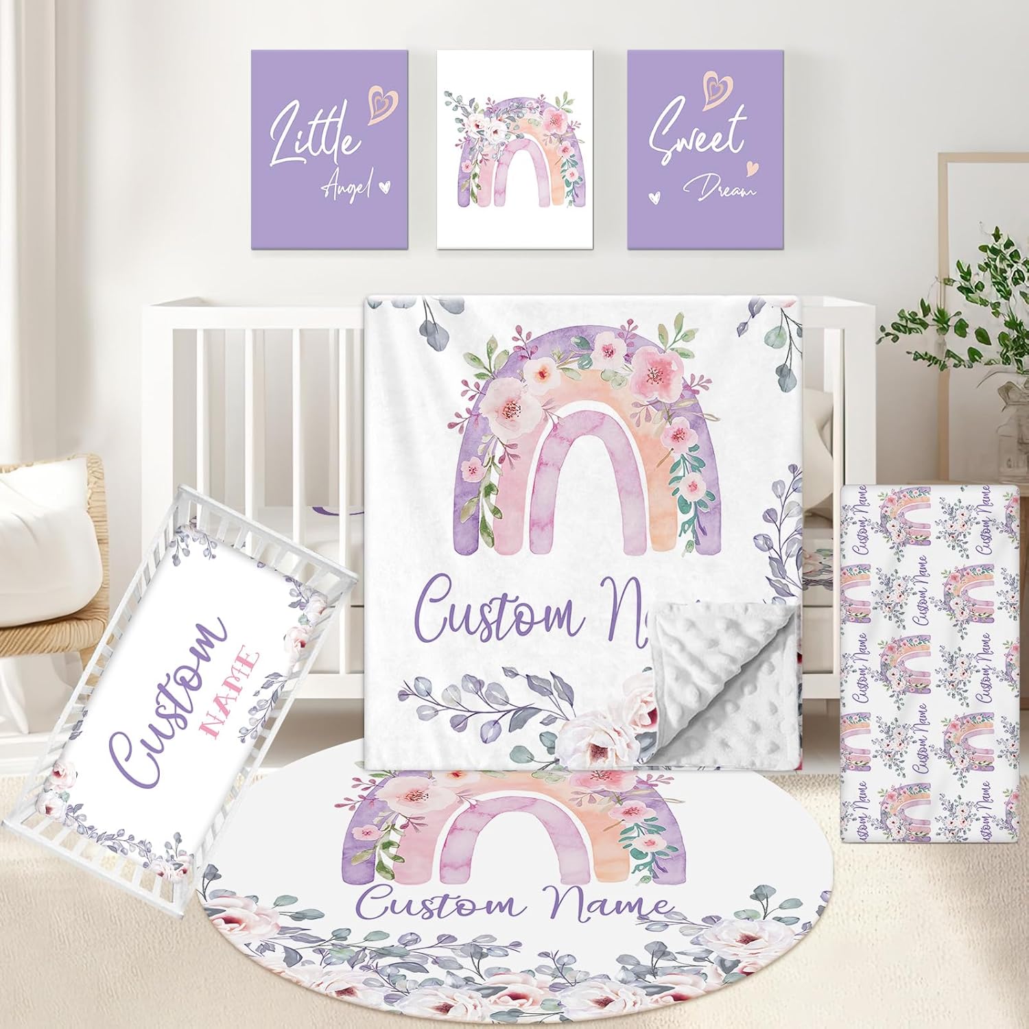 Personalized Baby Bedding Set, 5 Pcs Custom Baby Crib Set with Name, Soft Flannel Rainbow Crib Bedding Set for Girls, Double Layer Nursery Bedding Set, Infant Toddler Bedding Set Parents Gift