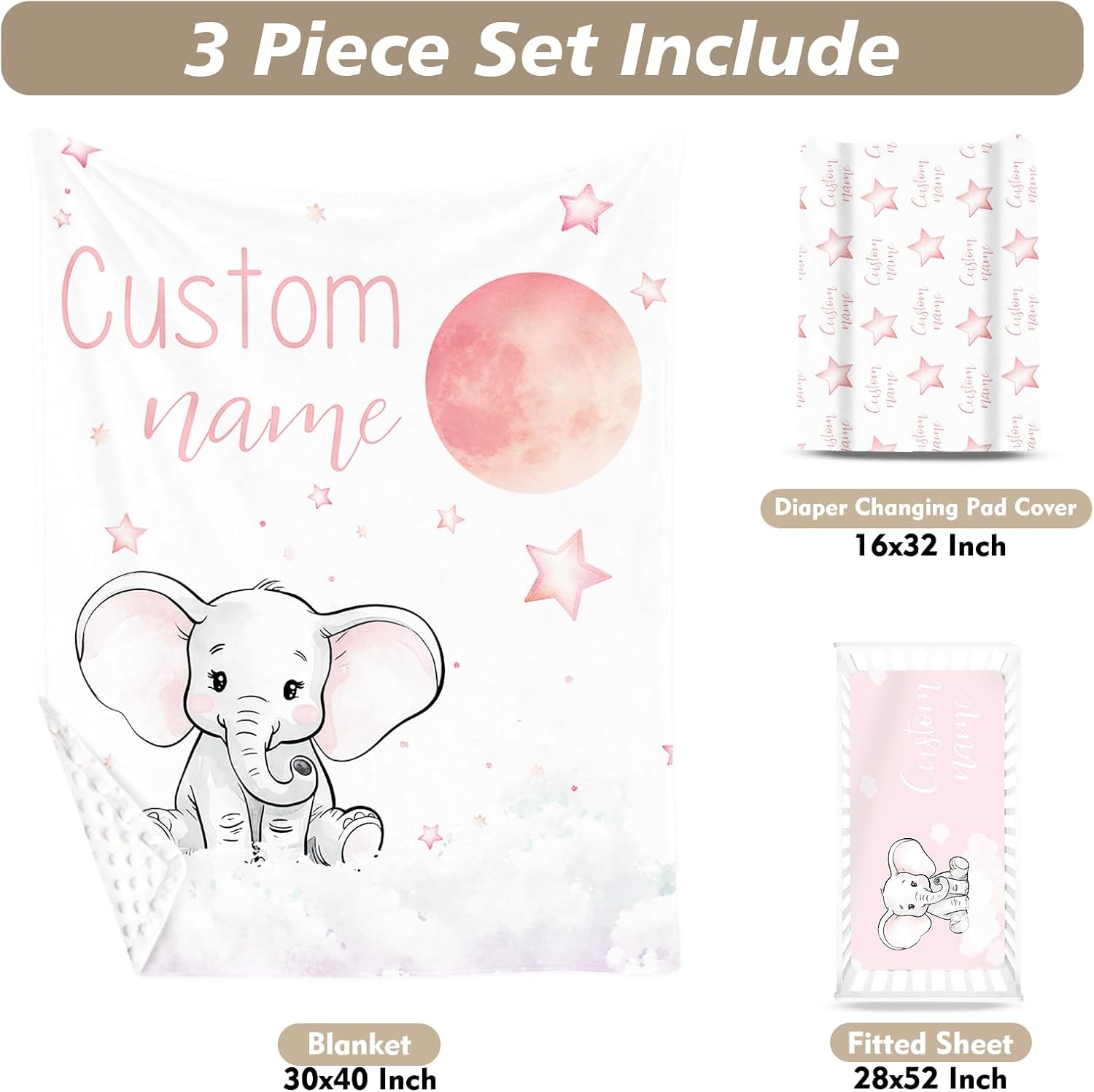 Custom Name Crib Bedding Set - Starry Sky Elephant Design, Personalized Baby Nursery Bedding 3-Piece Set– Soft Blanket, Fitted Sheet, Changing Pad Cover – for Newborns Girls Nursery Gifts