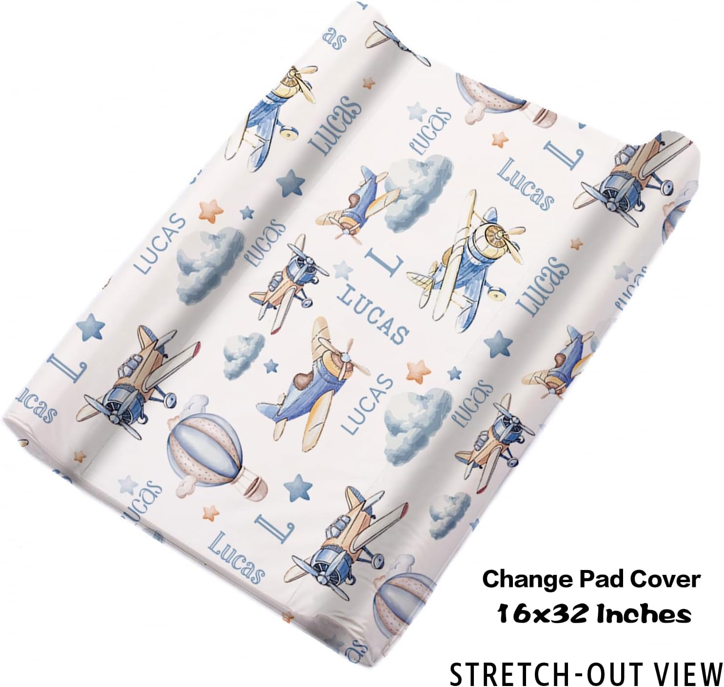Personalized Baby Crib Bedding Set for Baby Boys Girls, Toy Airplane Pattern Custom Name Baby Crib Sets 5-Pcs, Toddler Double Layer Blanket Fitted Sheets Changing Pad Cover Rug Wall Art Set