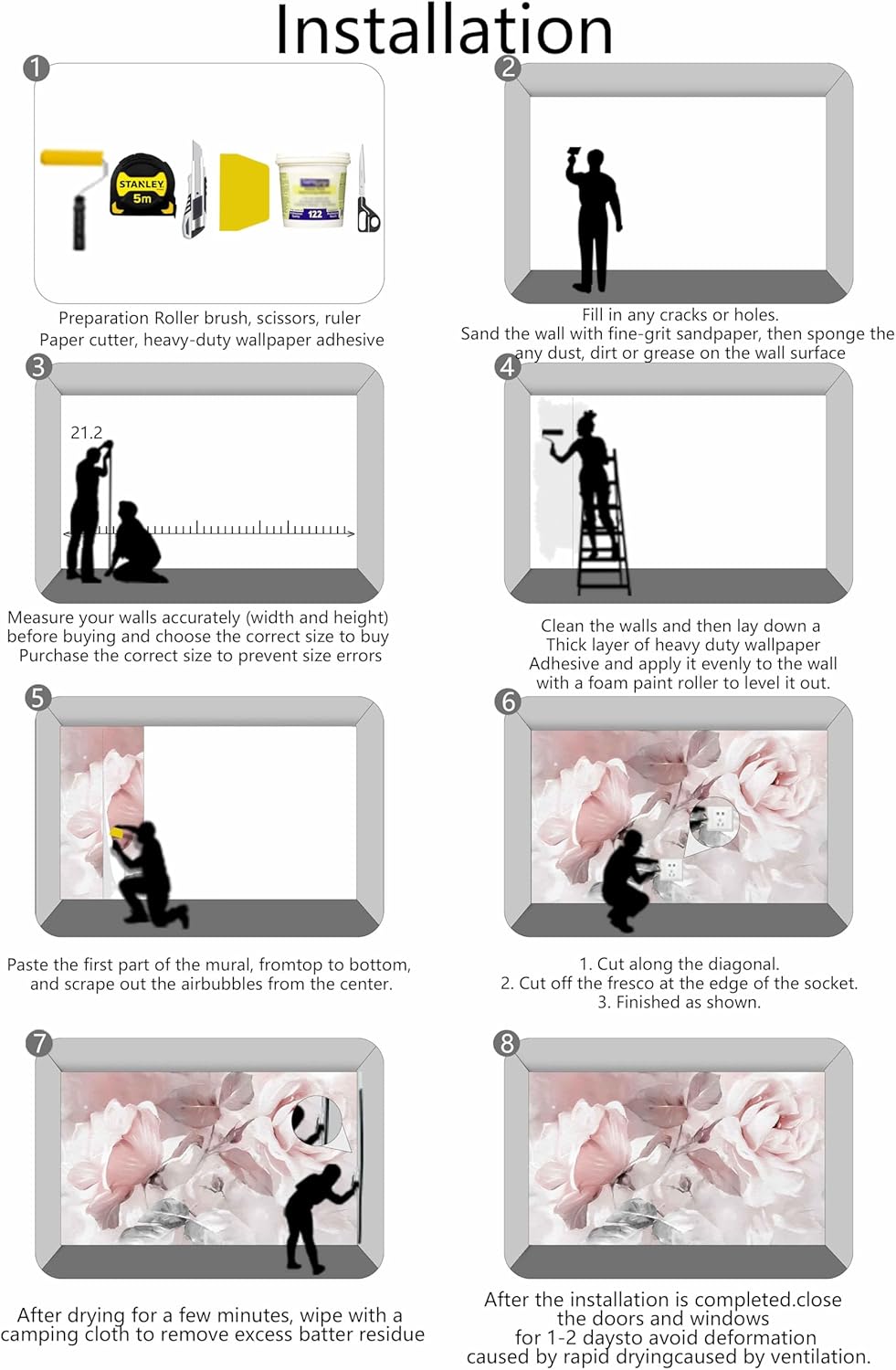 - Installation Steps1. Fill in any cracks or holes and clean the surface of the wall of dust, dirt and grease.2. Apply heavy-duty wallpaper paste to the wall, not the mural.3. Mark the position of each strip of wallpaper with a spirit level.4. Align the pattern and slide it into place.5. Scrape the bubbles with a spatula.6. Let it dry for a couple of minutes and it's ready to go!