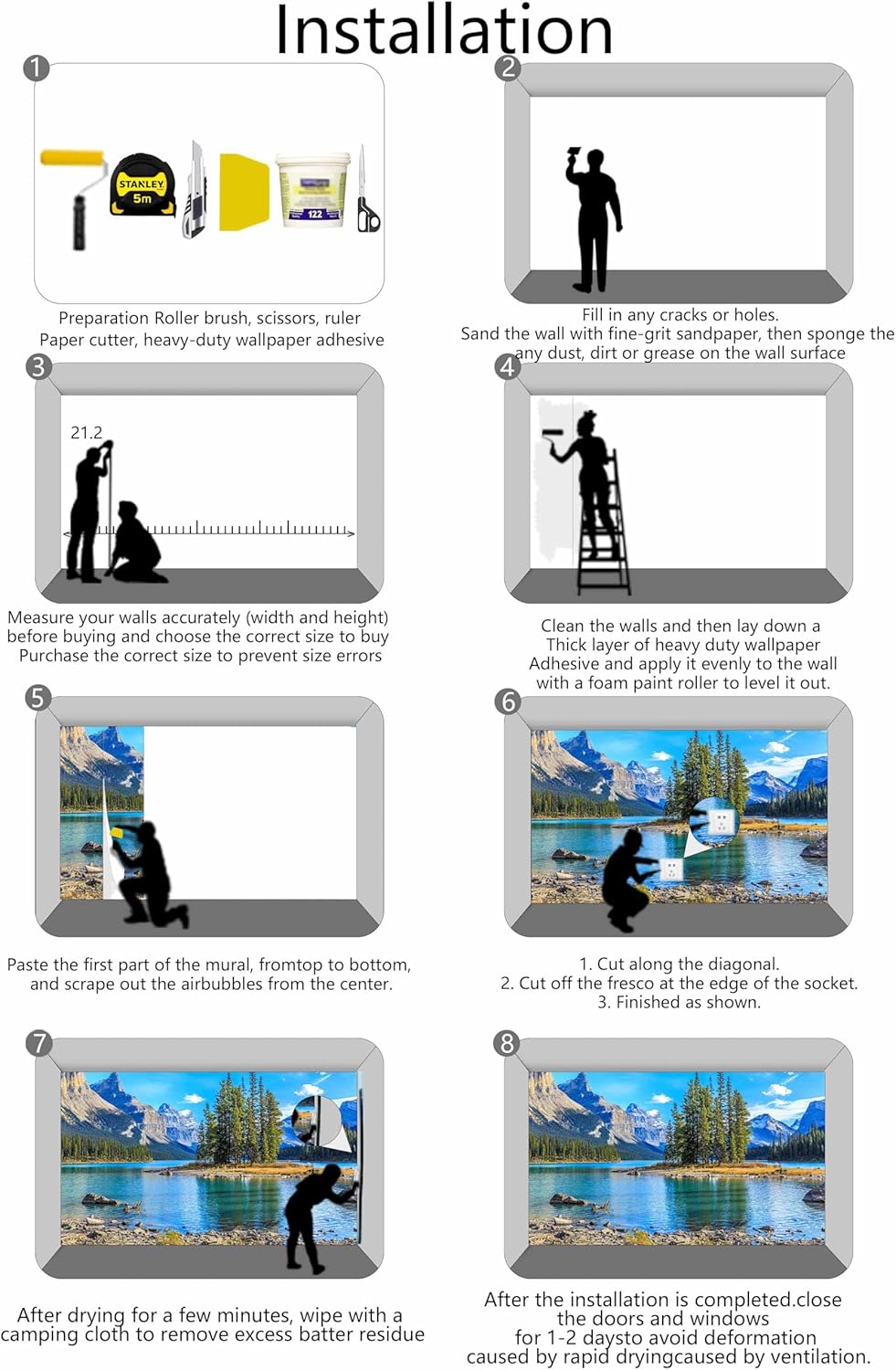 - Installation Steps1. Fill in any cracks or holes and clean the surface of the wall of dust, dirt and grease.2. Apply heavy-duty wallpaper paste to the wall, not the mural.3. Mark the position of each strip of wallpaper with a spirit level.4. Align the pattern and slide it into place.5. Scrape the bubbles with a spatula.6. Let it dry for a couple of minutes and it's ready to go!