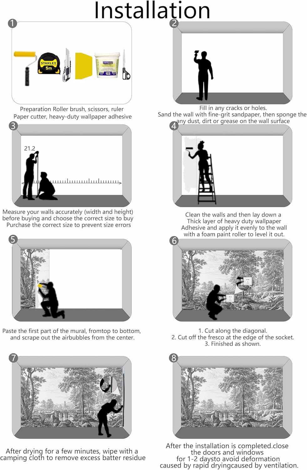- Installation Steps1. Fill in any cracks or holes and clean the surface of the wall of dust, dirt and grease.2. Apply heavy-duty wallpaper paste to the wall, not the mural.3. Mark the position of each strip of wallpaper with a spirit level.4. Align the pattern and slide it into place.5. Scrape the bubbles with a spatula.6. Let it dry for a couple of minutes and it's ready to go!