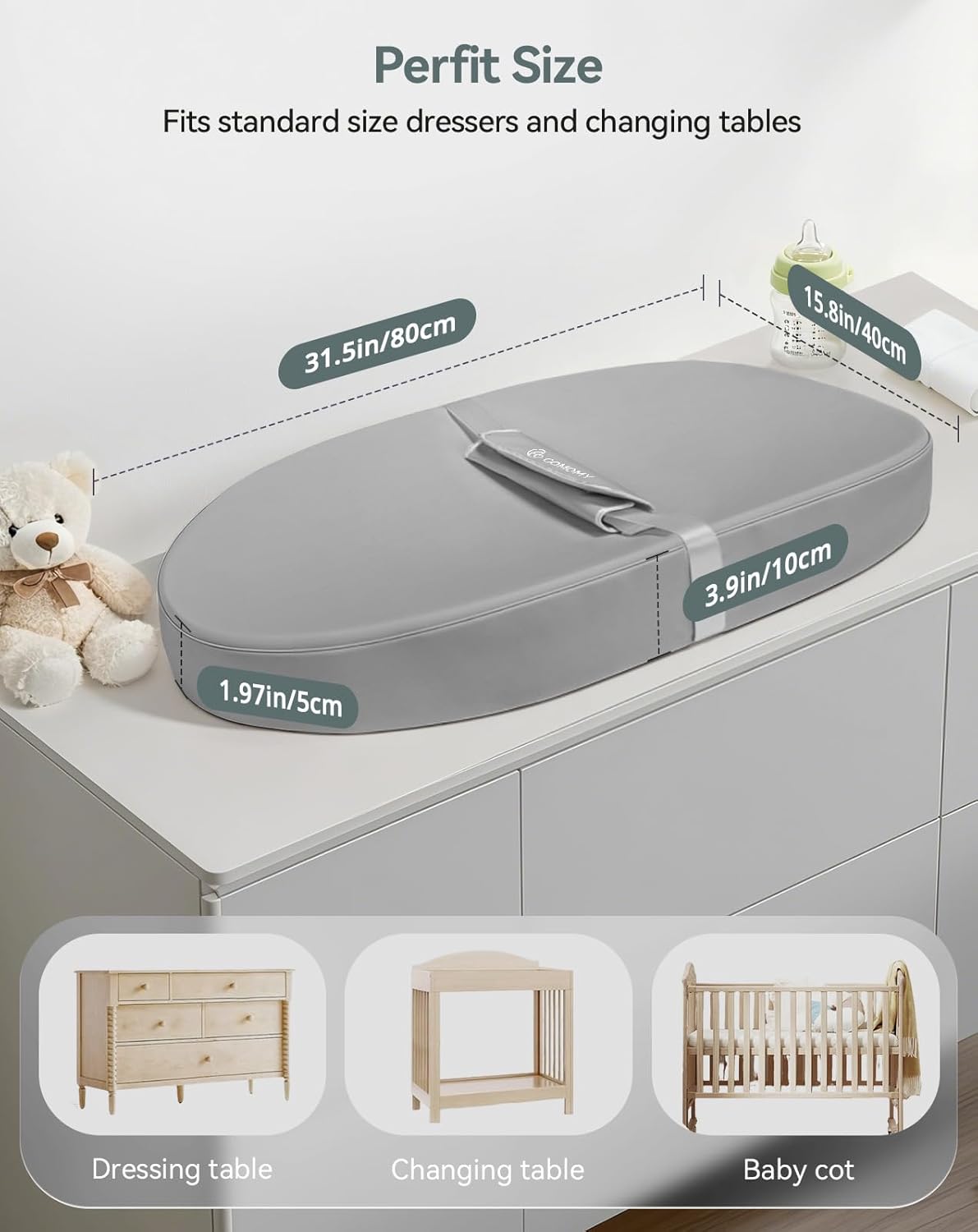 COMOMY Baby Changing Pad with Wipeable & Waterproof PU Cover, Contoured Diaper Changing Pad for Dresser with Non-Slip Safety Belt, Portable and Lightweight, Large Cushioned Foam, Gray